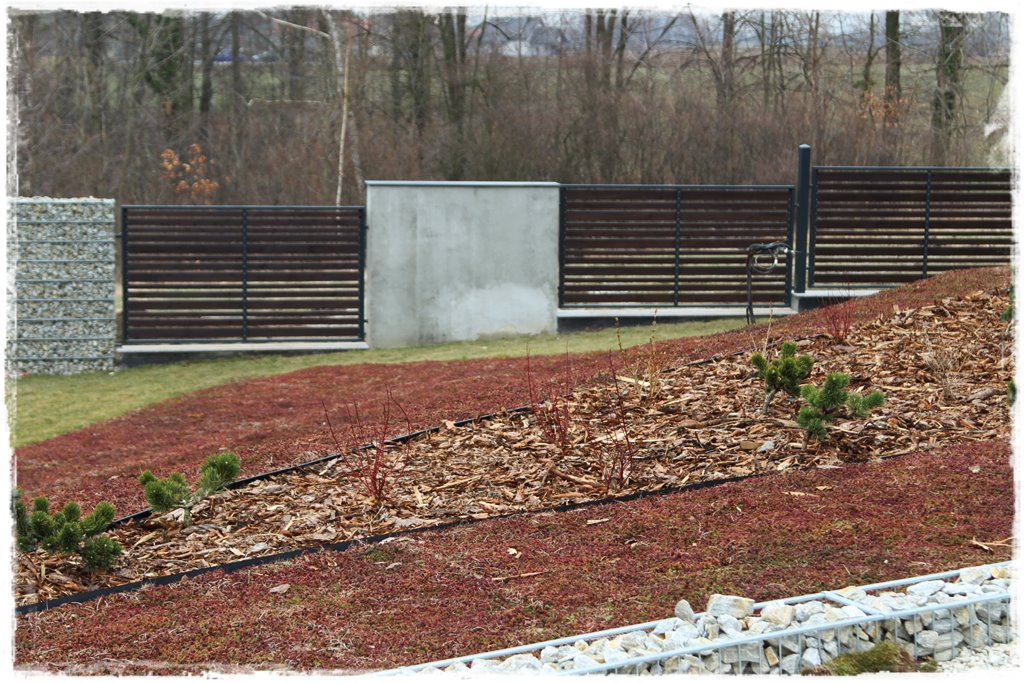 - oddzielenie powierzchni wyłożonych kamieniem można wykonać obrzeżem niższym jednak mimo wszystko takim aby minimalnie wystawało ponad powierzchnię wyłożonego kamienia. Mimo, że kamień dużo mniej przemieszcza się niż kora to jednak nie zaszkodzi również stworzyć mu małe „oparcie”.