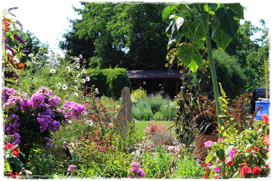 Jednak kolory roślin to dopiero połowa możliwości, jaką masz do dyspozycji. Bo na to wszystko nakładają się jeszcze kolory innych elementów, przedmiotów, dekoracji i zagospodarowania, które ogród potrafią dodatkowo wzbogacić. Jak na poniższym zdjęciu, gdzie na tle kolorowych roślin, ładne wyglądają kolorowe przedmioty.