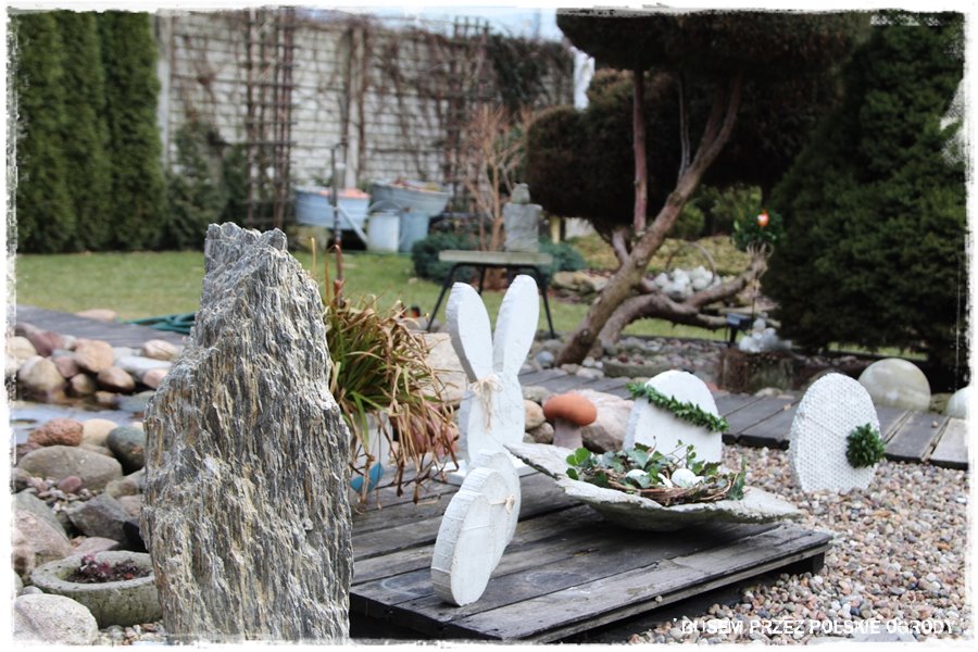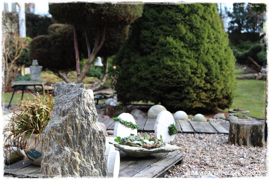 Osobiście jestem zwolenniczką kwiatów, rustykalności… bałaganu, ale ten ogród nie przytłacza iglastą statycznością – może właśnie przez betonowe ozdoby. Bo na nich można się skupić. Ogród zaczyna tworzyć dla nich tło (a nie odwrotnie 😛 ).