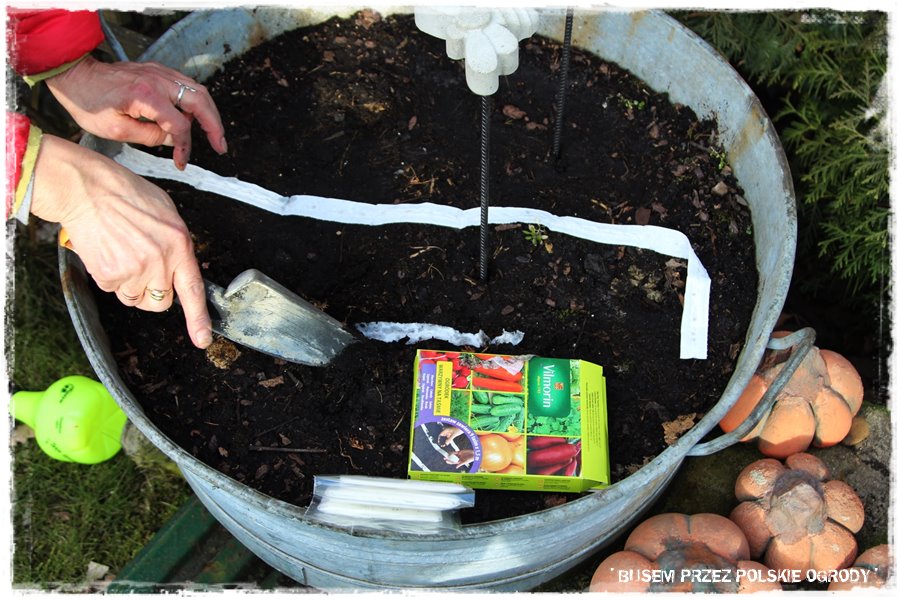 Niemniej wciąż brakowało nam zajęcia przy roślinach, o które aż prosiło się przy tak słonecznej pogodzie, i jakby nie było, praktycznie już w połowie marca. Stąd przygotowany został sprzęt, czyli opryskiwacz do podlania oraz nasiona na taśmie, które zakopaliśmy w niezwykle efektownym warzywniku.
