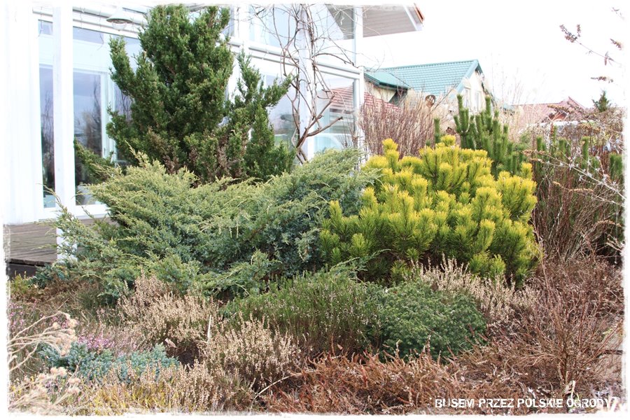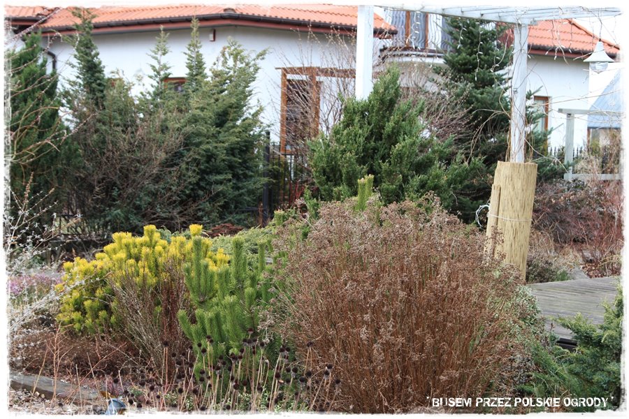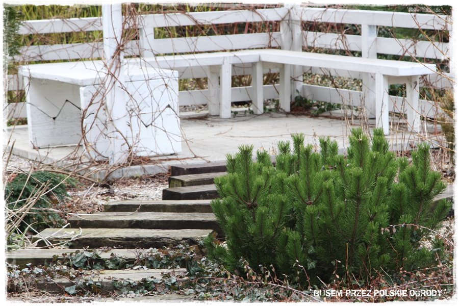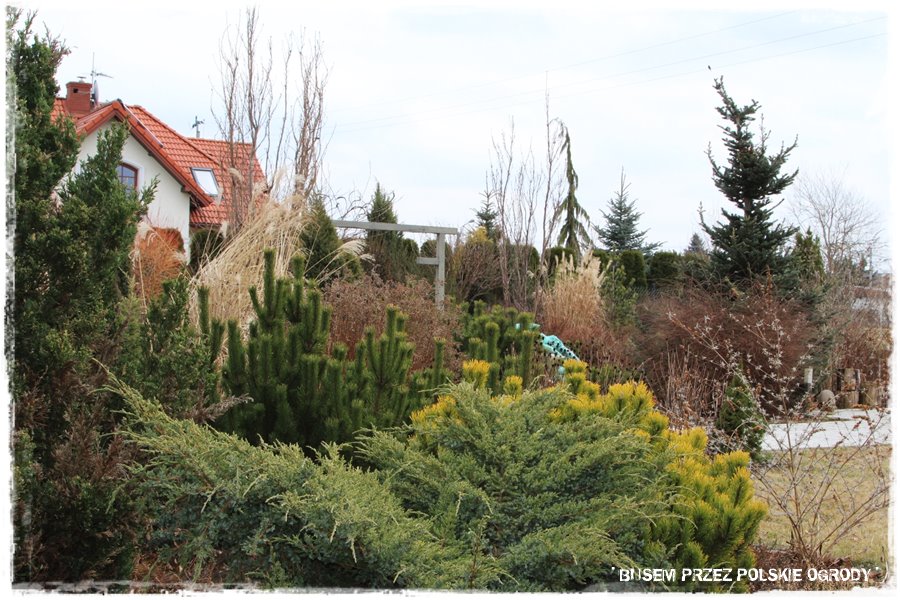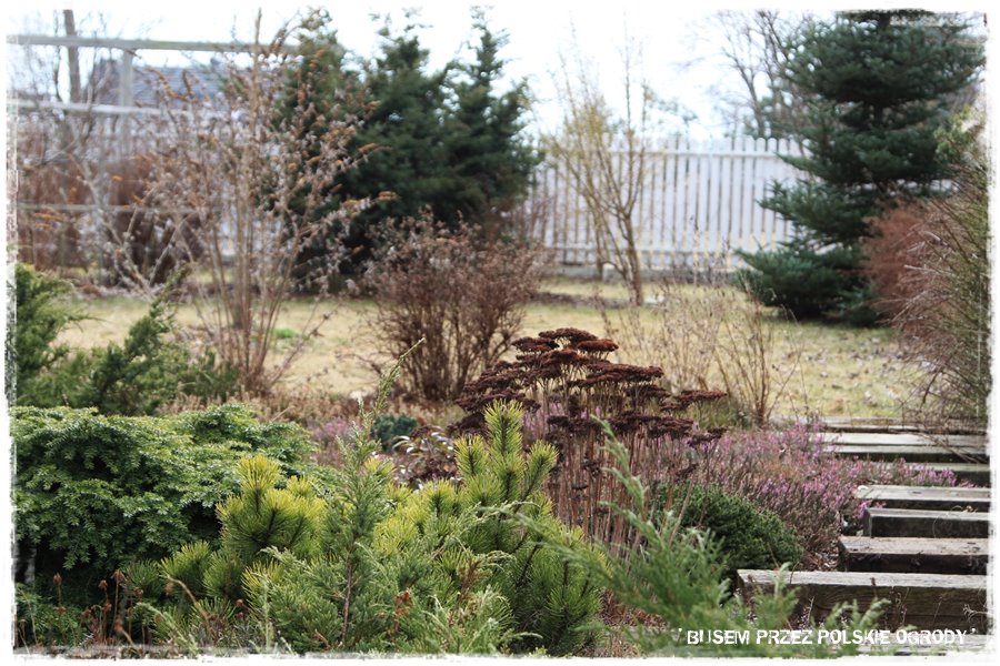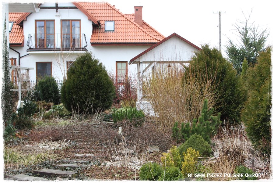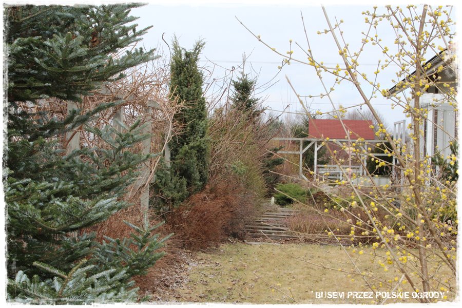 Co prawda nie jest to ogród typowo iglasty, jak było to na przykład w pierwszym i trzecim odwiedzonym ogrodzie, gdzie to rośliny iglaste stanowiły pewnego rodzaju szkielet. Wyznaczały obrys ogrodów, a jednocześnie sprawiały, że mimo zimy nie były “puste”. W tym ogrodzie roślinność jest zdecydowanie zróżnicowana, mieszana iglasto – liściasta. Występuje również sporo bylin, które jak się domyślasz, w marcu raczej nie błyszczą.