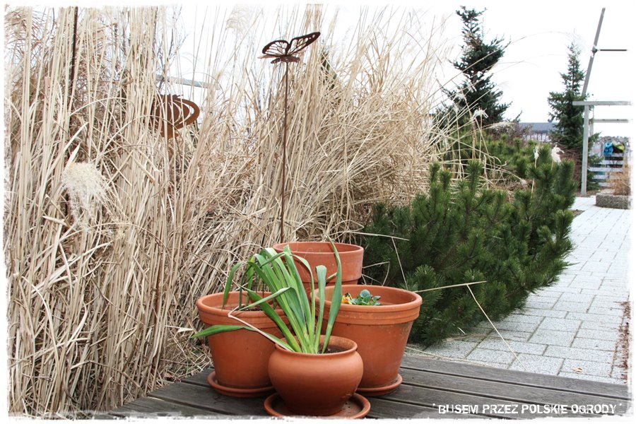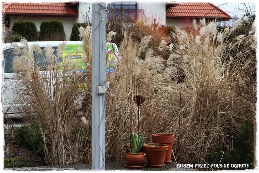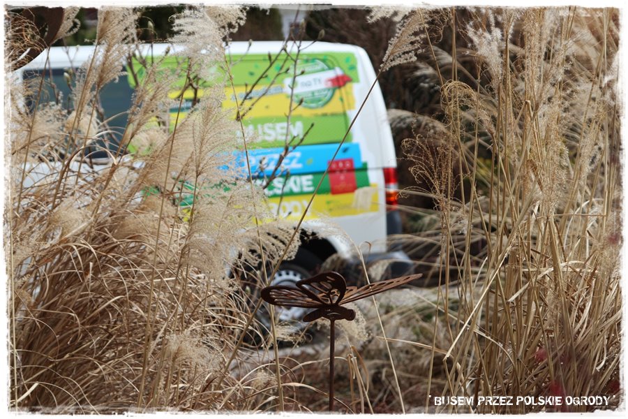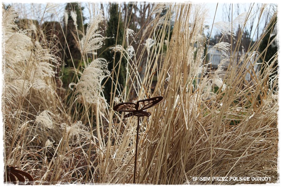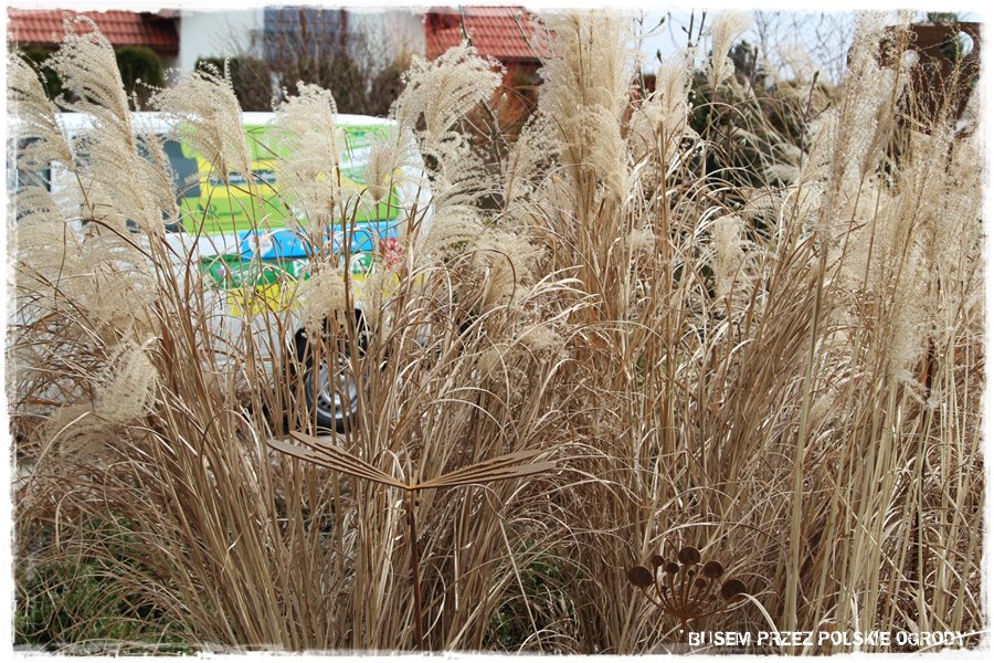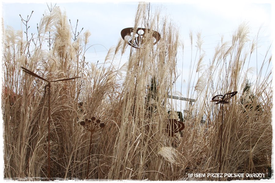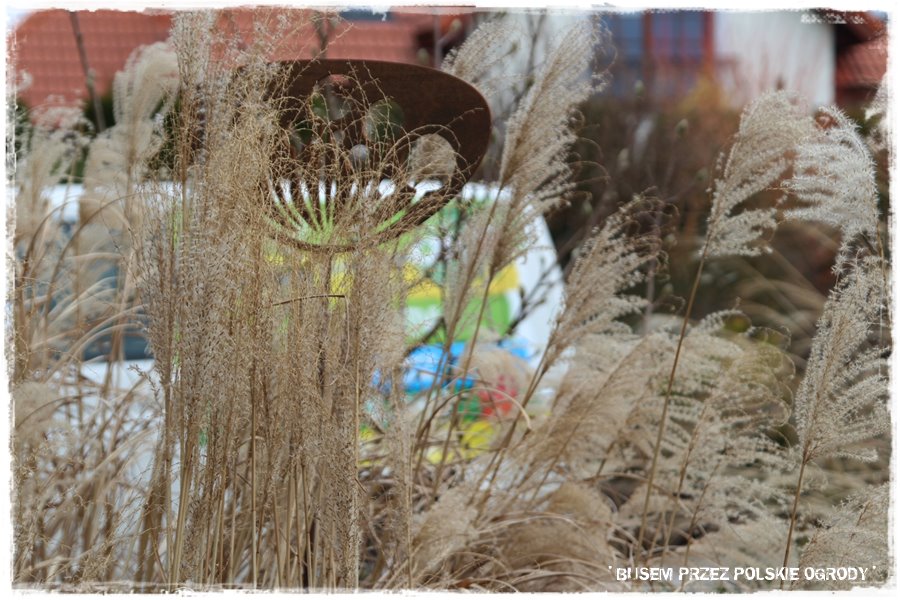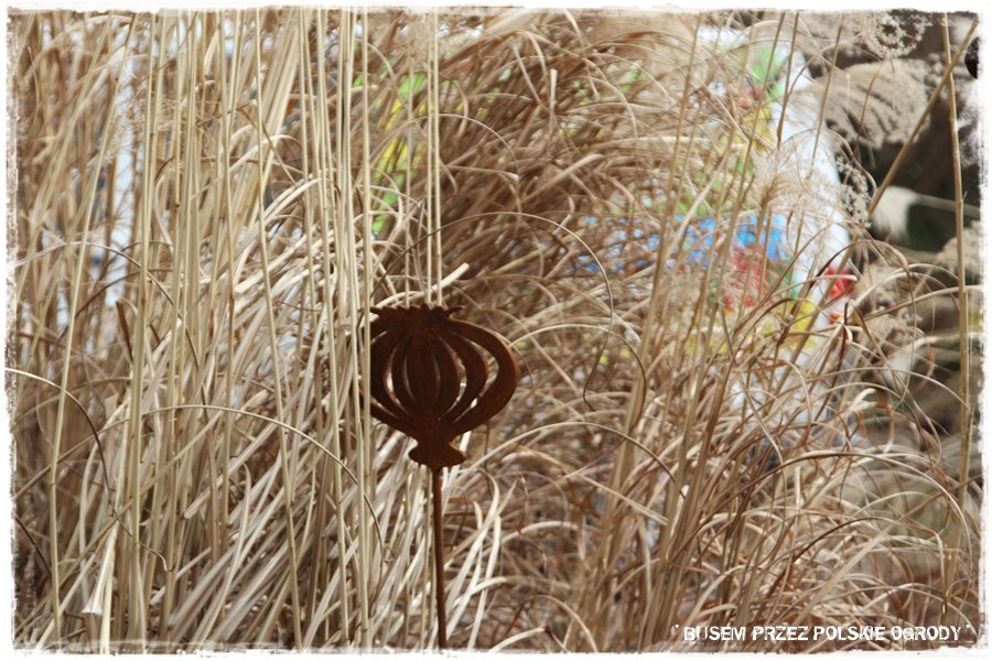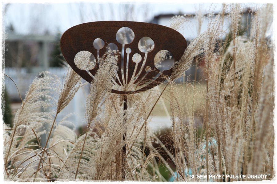 Obok wrzosowisk, elementem najbardziej rzucającym się w oczy, są duże skupiska traw ozdobnych. Oczywiście w tym okresie zasuszonych, ale ciekawie wyglądających na tle ogrodu. Dodatkowym, fajnym uzupełnieniem traw, są wkomponowane w nie metalowe ozdoby, pokryte rdzawym nalotem. Super fajna dekoracja, na żywo wyglądająca jeszcze bardziej efektownie.