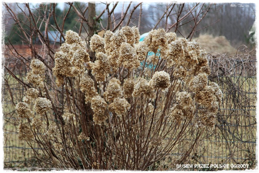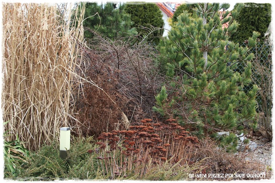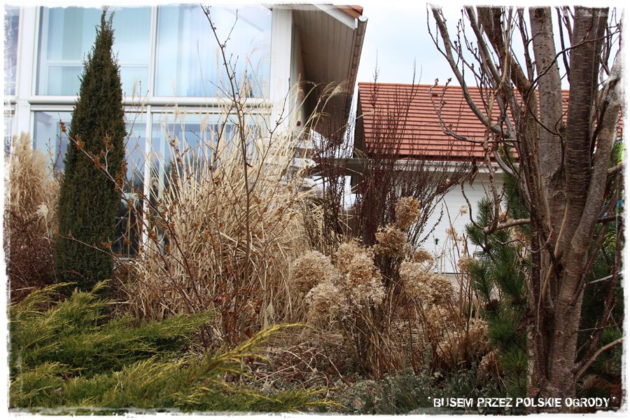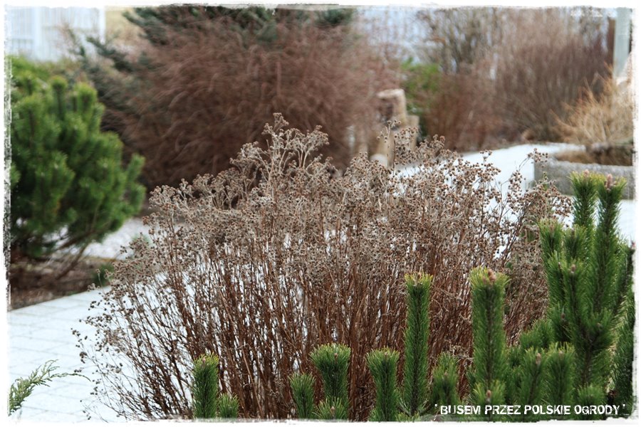 Kolejnym z ważniejszych elementów roślinnych w ogrodzie są ogólnie mówiąc “suszki”. Czyli nie ścięte jesienią, zasuszone rośliny. W okresie zimowym wyjątkowo efektownie się prezentują, kontrastując swoimi brązami z zielonymi roślinami.