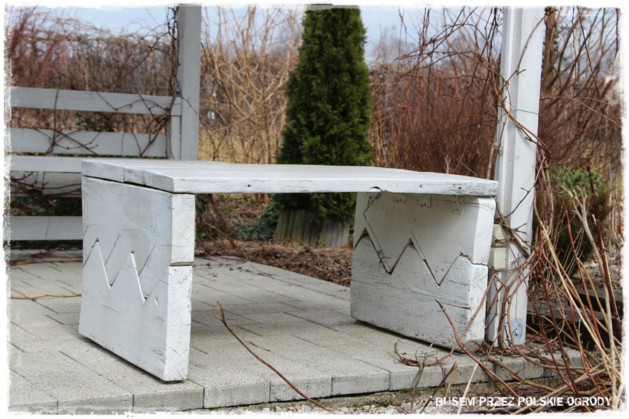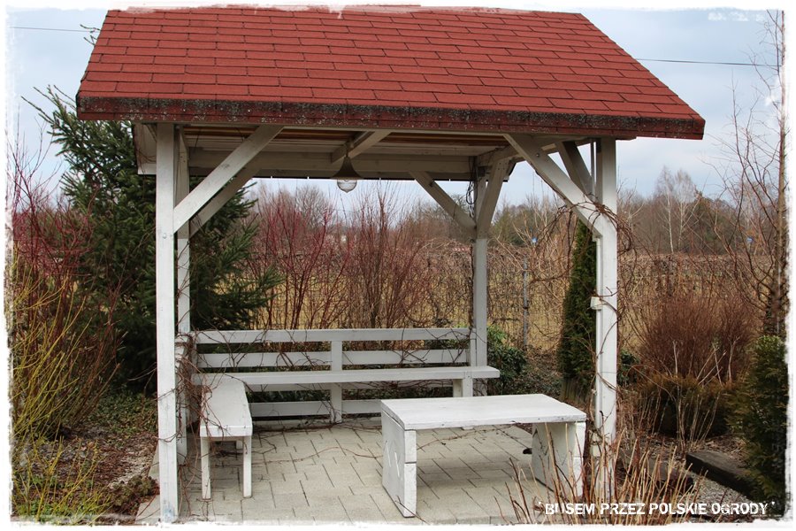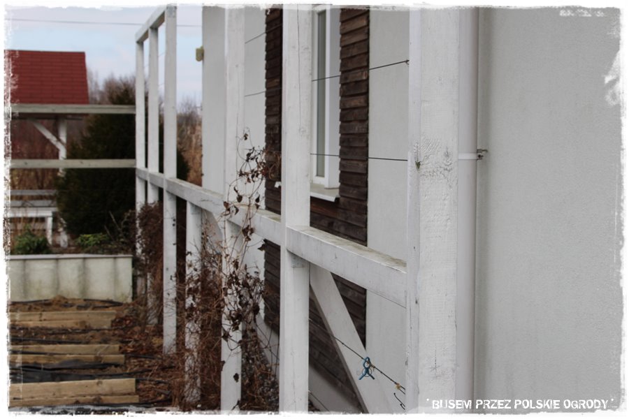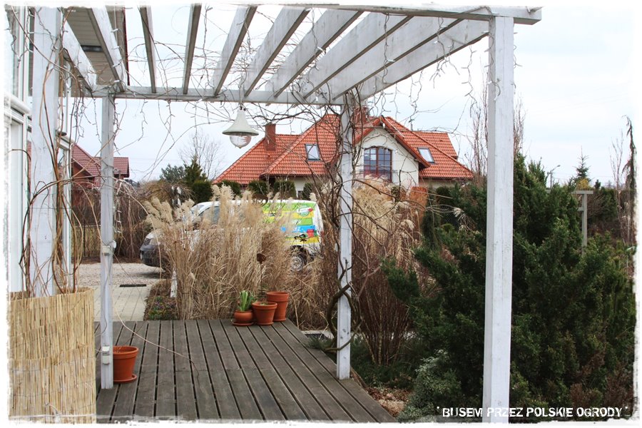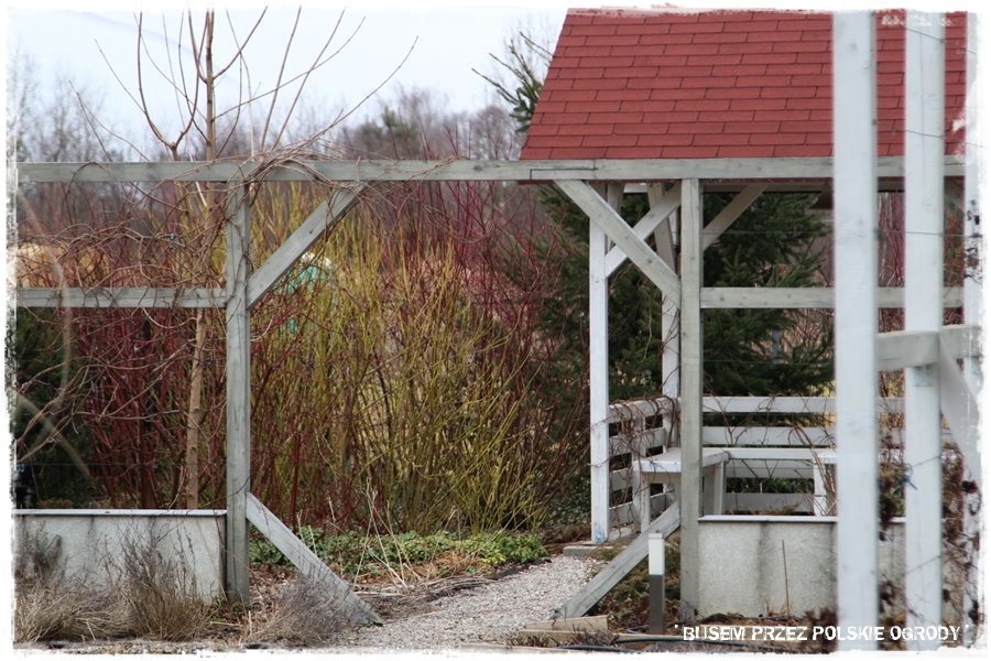Jednak znakiem szczególnym i wyróżnikiem tego ogrodu są drewniane elementy zagospodarowania tzn. liczne pergole, kratki, altanki i wszelkiego rodzaju mniejsze i większe konstrukcje. Co ciekawe wszystkie zrobione są w podobnym stylu, w jasnym, pastelowym kolorze. A jeszcze ciekawsze jest to, że powstały prawie przypadkowo tzn. z pozostałego nadmiaru drewna zamówionego do budowy domu.