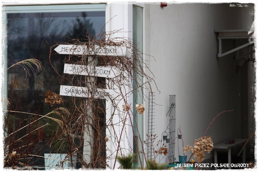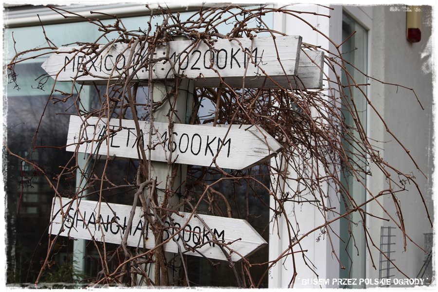 Szczególnym elementem w tych drewnianych aranżacjach jest specjalny “drogowskaz”, na którym Właściciele ogrodu mocują tabliczki z nazwami i odległościami do miejsc, które odwiedzili. A jak się im uważnie przyjrzysz, zobaczysz, że są to bardzo odległe i niecodzienne lokalizacje.