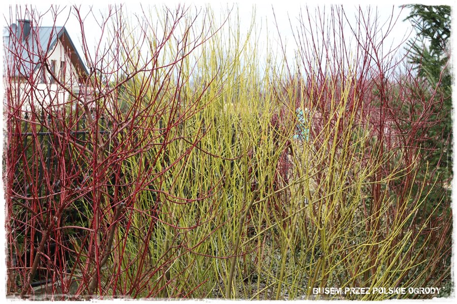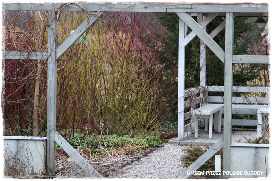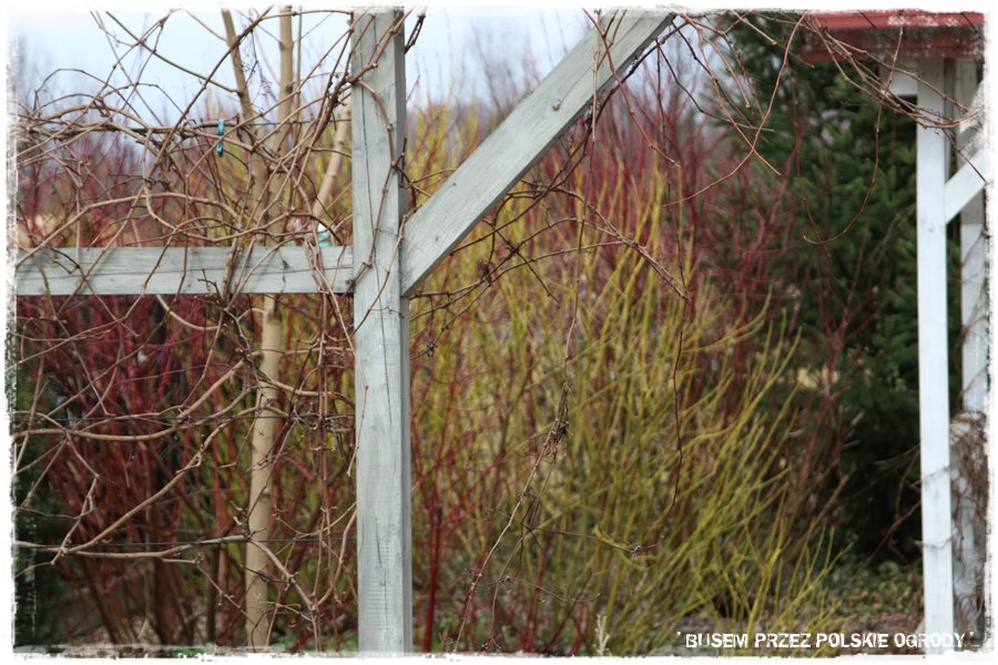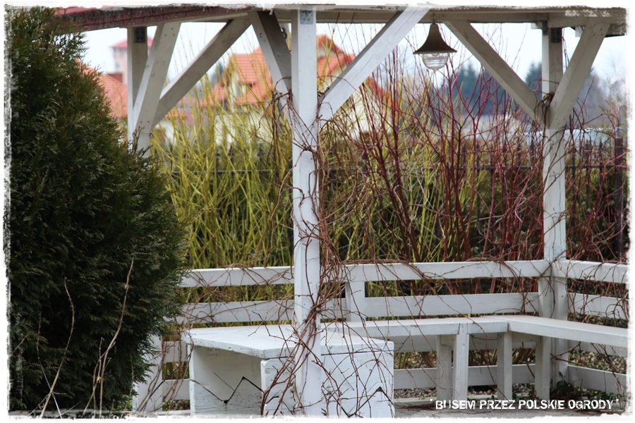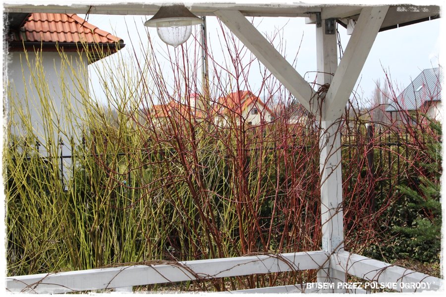 Wspomniane drewniane elementy, w szczególności biała, pastelowa altana, ciekawie prezentują się na tle kolorowych pędów dereni. A zatem to kolejne rośliny, w które warto inwestować z myślą o okresie zimowym.