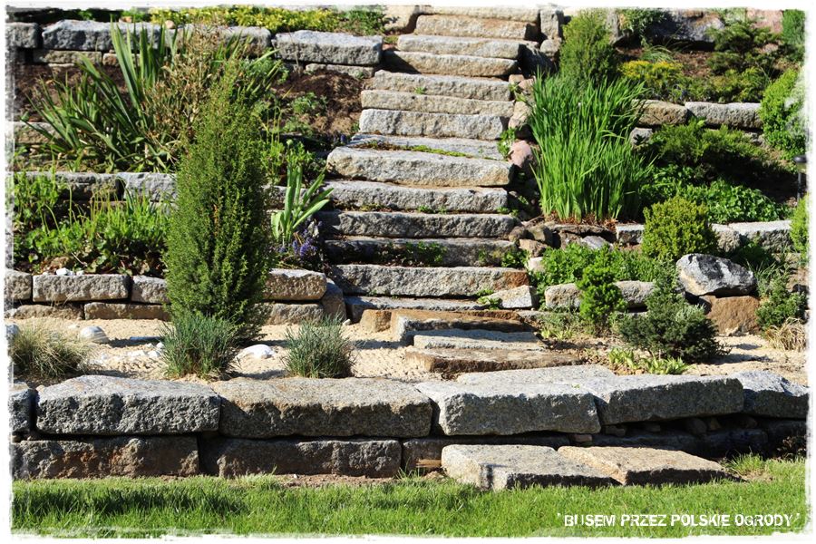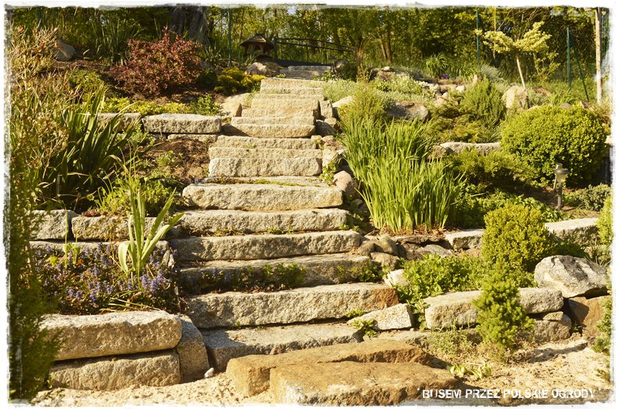 To duża konstrukcja z wielkich, kamiennych elementów. Jak się im uważnie przyjrzysz, zobaczysz, że są nieregularne, ale też zupełnie nieregularnie układane. Nie jest tu zachowana proporcja, właściwie każdy element jest tu sam dla siebie. Ale w całości tworzy to fają konstrukcję, lekko po łuku, która prowadzi od ogrodu, bezpośrednio do znajdującego się z tyłu lasu. Dodatkowo po bokach schodów z podobnych dużych kamieni ułożone są niewysokie murki, które zamieniają jednolity spadek skarpy, w takie bardziej poziome półki – tarasy. A zatem powstał ciekawy, tarasowy kawałek ogrodu, dodatkowo bujnie i różnorodnie obsadzony.