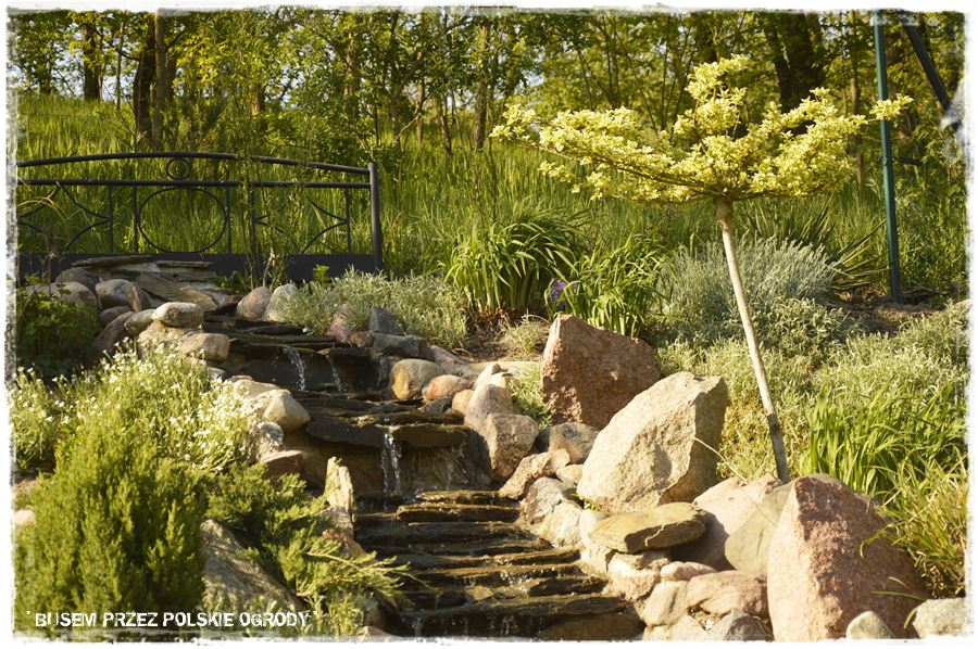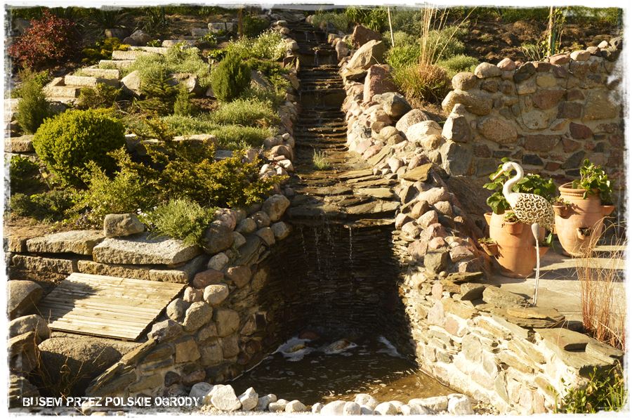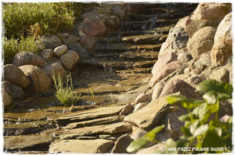 Elementem pobocznym do schodów jest kamienny strumień, również zbudowany lekko po łuku i wychodzący jakby z tego samego punktu co kamienne schody. Jednak jest wykonany z zupełnie innych kamieni. Boki to wymurowane koryto z tych wykopanych na działce kamieni, a środek, po którym spływa woda, to starannie ułożone, płaskie łupki.
