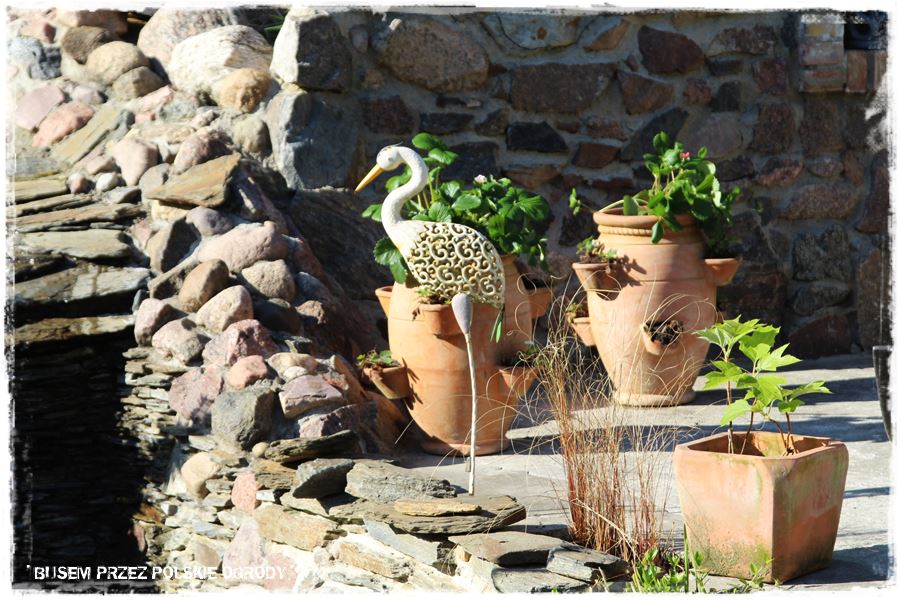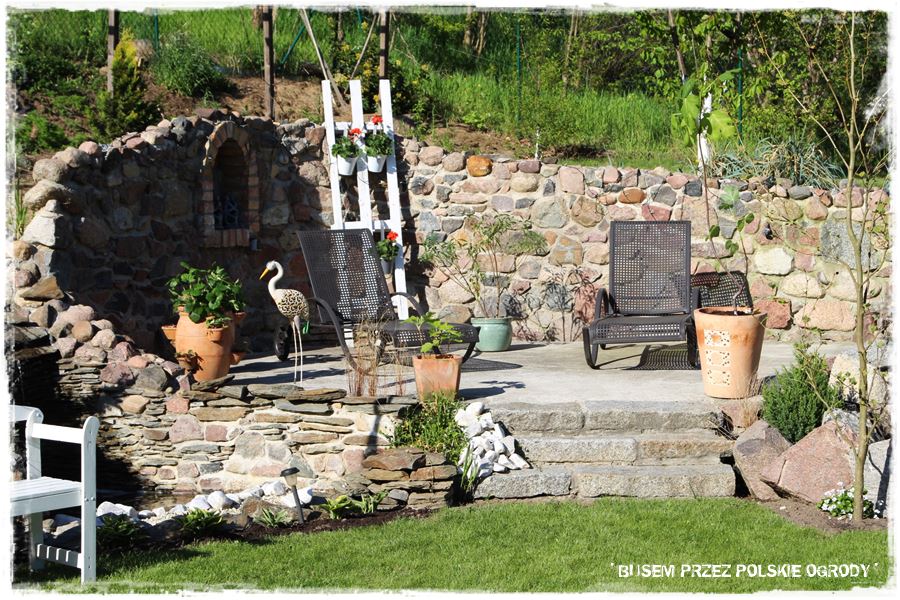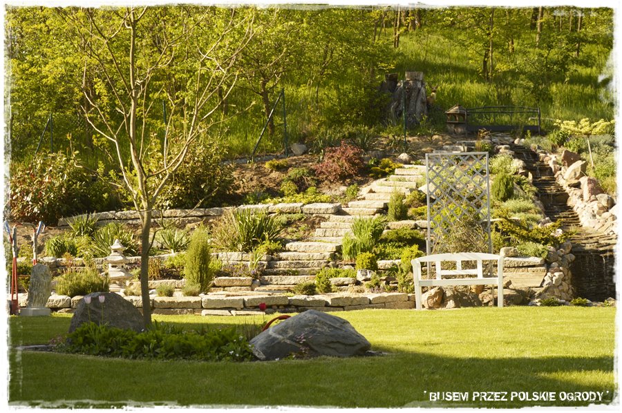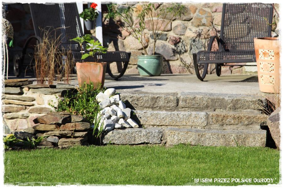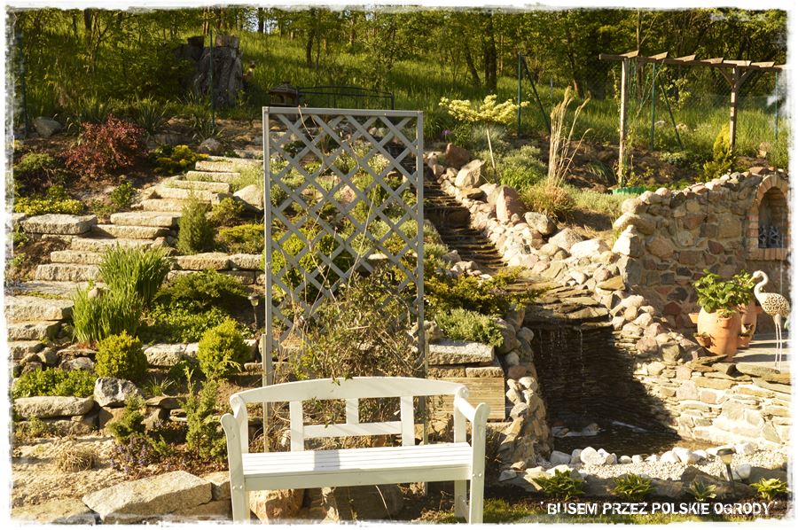 Jak wspomniałem, w ogrodzie tym, kamień posłużył do stworzenia niezwykle atrakcyjnych budowli, które dodatkowo fajnie wpisały się w pozornie trudne ukształtowanie terenu. Na szczególną uwagę zasługuje duża skarpa z tyłu ogrodu, na której ciekawie zostały rozwiązane kamienne schody prowadzące z ogrodu do lasu, obok nich kamienny strumień, a obok niego prawdziwie toskański zakątek wypoczynkowy, który Właścicielka nazywa “amfiteatrem”.
