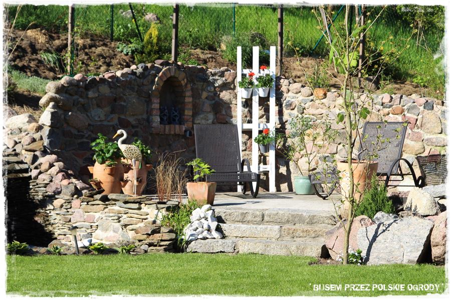 Jednak prawdziwe dzieło sztuki, a zarazem super oryginalna budowla, to kamienny amfiteatr, jakby żywcem przeniesiony z jakiegoś egzotycznego zakątka Świata. Natomiast w praktyce to oryginalny podest, idealne miejsce do wypoczynku i podziwiania całego ogrodu. Znajduje się w jego tylnej części, na lekkim wzniesieniu, stąd można tam siedzieć, wypoczywać i spokojnie spoglądać na całość terenu. Podest, a właściwie jego obudowa, to również element zrobiony z pozyskanych na działce kamieni. Tylko efektownie ułożonych i wymurowanych.
