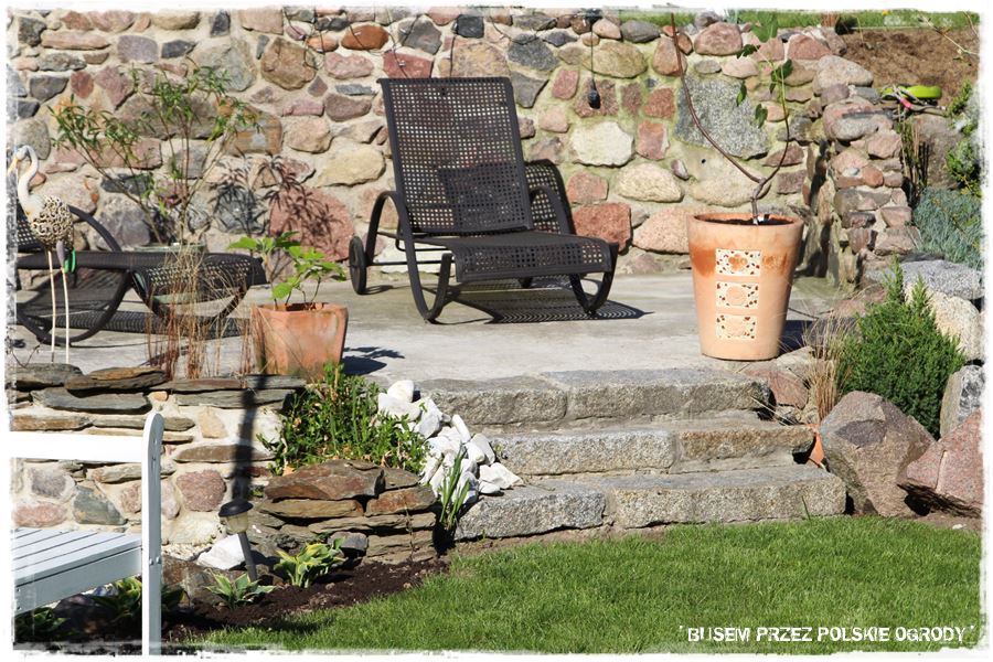 Tutaj są to różne, mniejsze i większe głazy, które jak się okazało zostały wykopane na tej właśnie działce. Przy budowie domu, podczas kopania pod fundamenty, okazało się, że są tam jakieś resztki starych zabudowań, z których właśnie pochodzi ten kamień. A zatem przypadkowo pojawił się materiał, który trzeba było jakoś wykorzystać. I tak zostało zrobione, wykorzystane w całości i w sposób perfekcyjny.