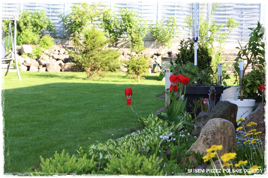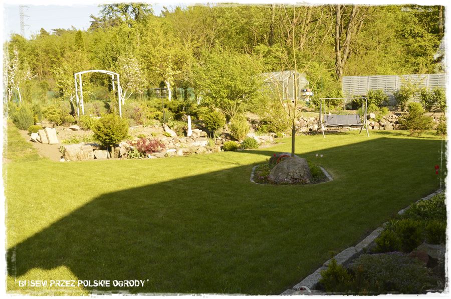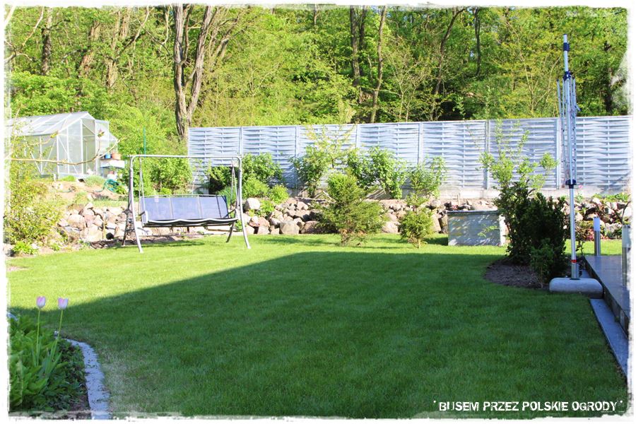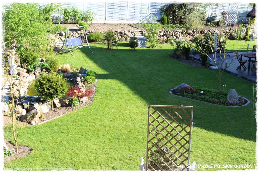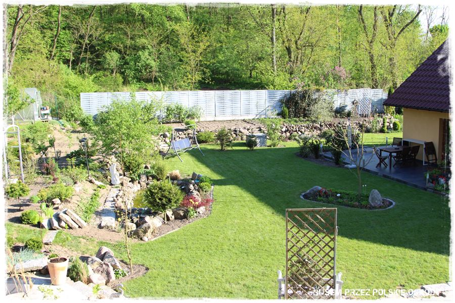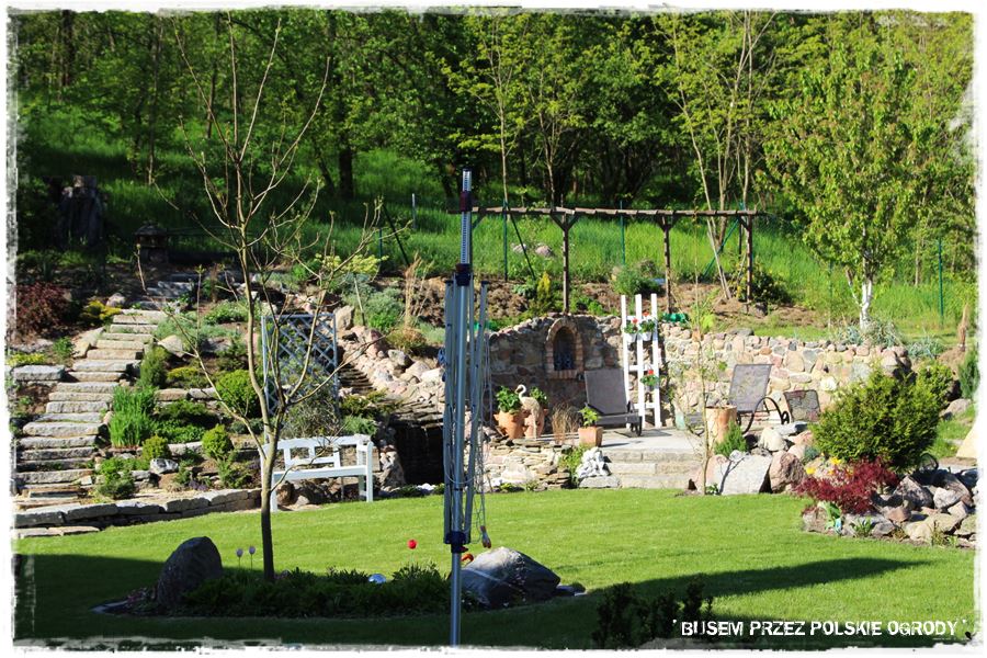 Na zakończenie kamiennych elementów, wspomnę jeszcze o kamiennych obrzeżach, a właściwie umocnieniach skarp otaczających ogród. Widać je dobrze tam w górnej części zdjęcia, pod tym drewnianym parawanowym ogrodzeniem. Umocnienia te tworzą zarazem możliwość, że cała otaczająca część trawnika jest lekko wyżej, tworząc taka podniesioną półkę. Zresztą to na niej umieszczony jest warzywnik oraz różnego rodzaju owocowe drzewa i krzewy.
