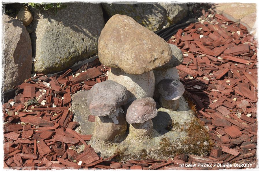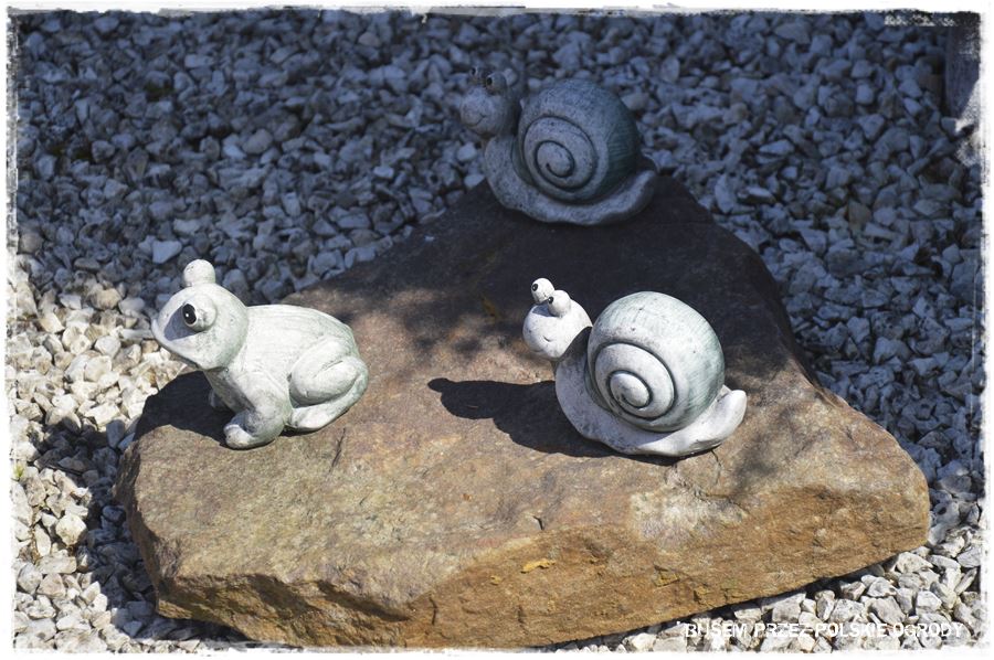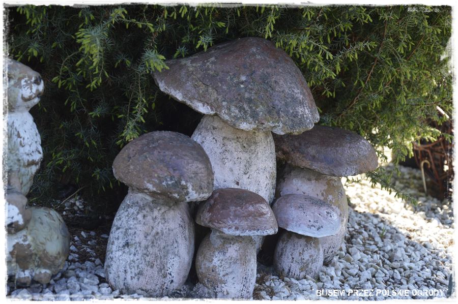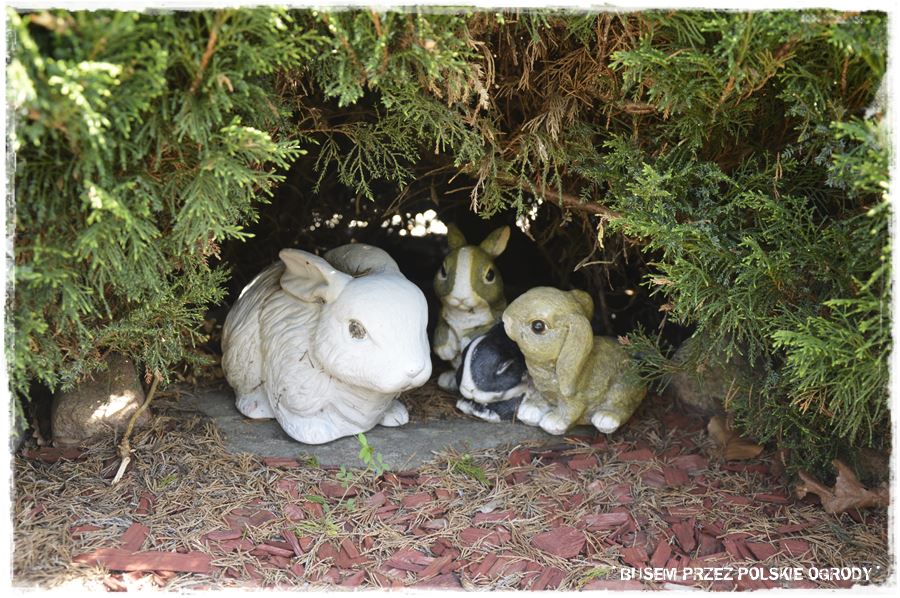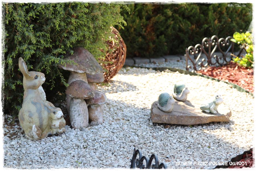 To grupa dekoracji, która dosłownie rozsiana jest po całym ogrodzie. Gdziekolwiek się tam spojrzy, coś siedzi pod krzaczkiem, na kamieniu czy pniu. I wcale nie są to jakieś wyszukane ozdoby, ale zwykłe malutkie figurki, na widok których człowiek uśmiecha się sam do siebie.