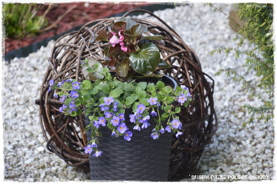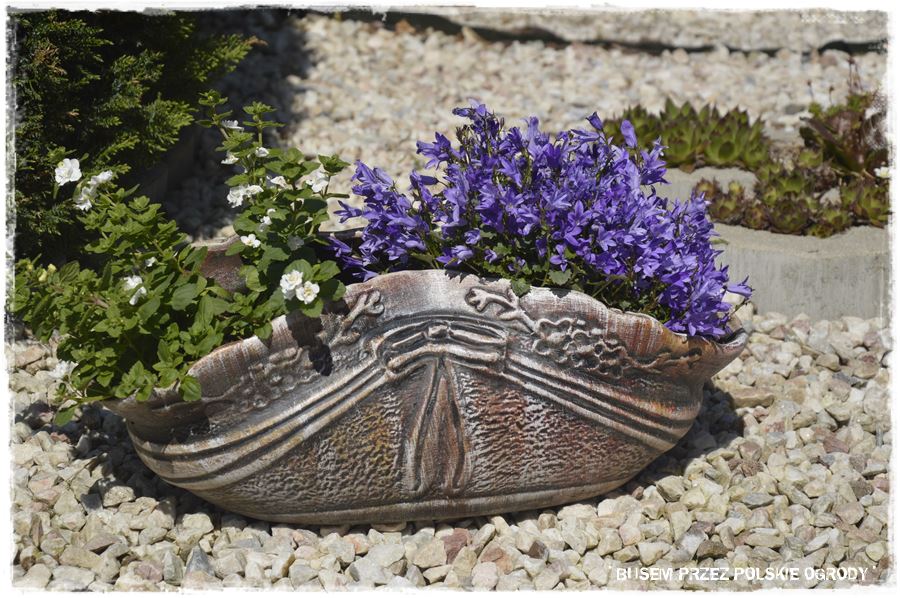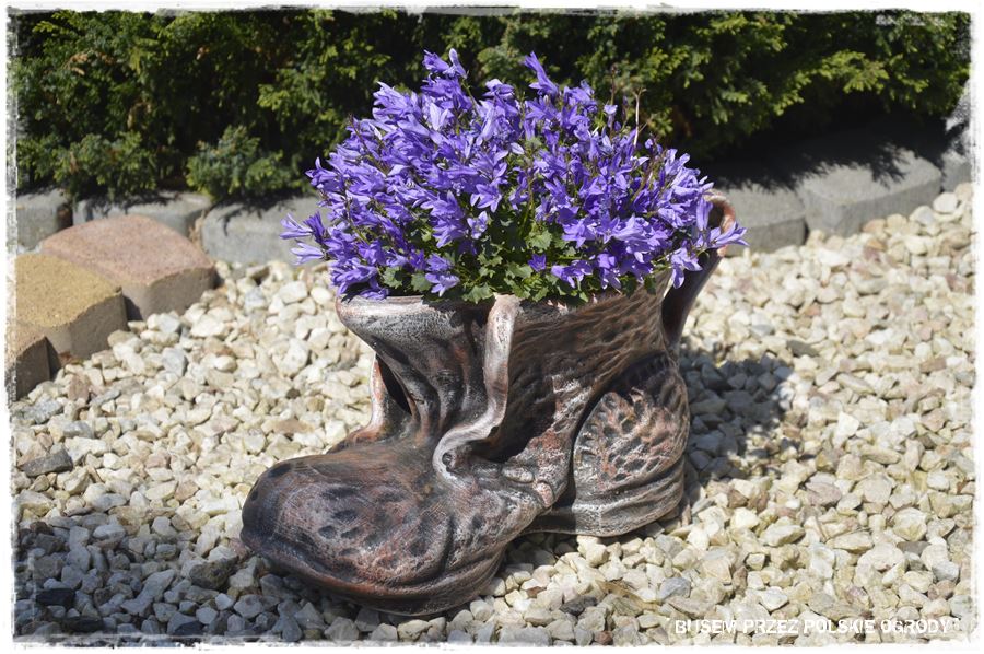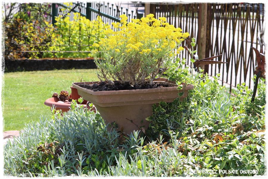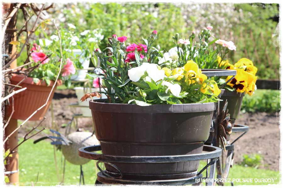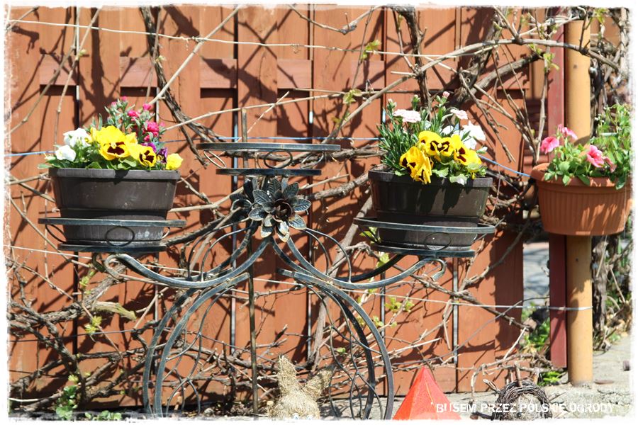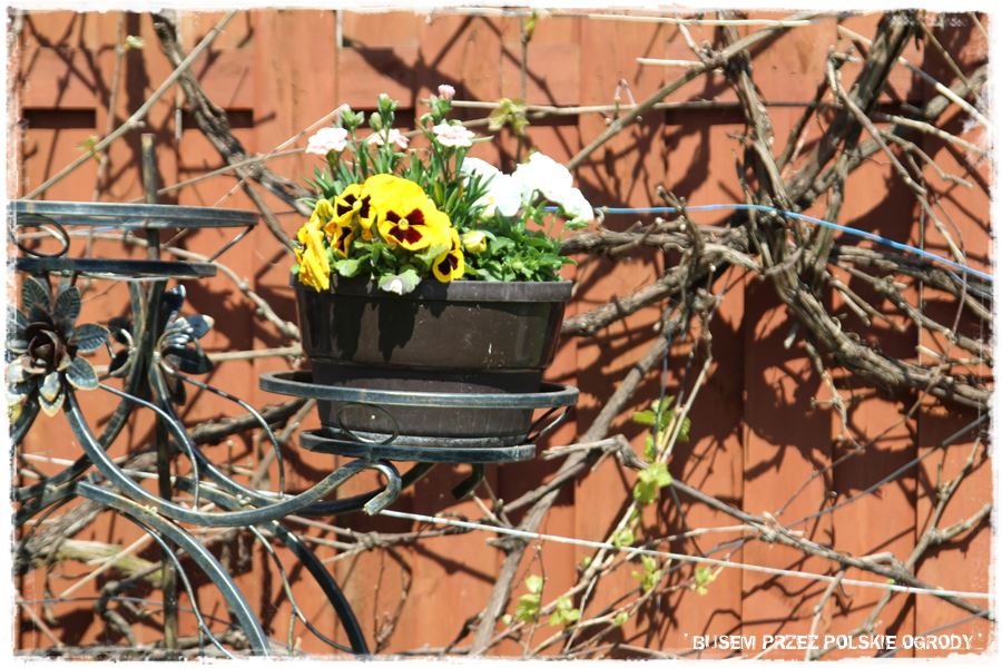 Czyli oczko w głowie Joli. Rośliny w pojemnikach, donicach, doniczkach, butach, kratkach chodnikowych oraz dosłownie gdzie i w czym się da. A i tak z racji, że to kwiecień, nie były jeszcze w pełnym rozkwicie. Niemniej jednak już zachwycają. I to zarówno swoimi kolorowymi, sympatycznymi kompozycjami, jak również tym, że są w tym ogrodzie praktycznie wszędzie. W każdym zakątku coś stoi, jak nie stoi to wisi, a jak nie wisi to leży. Ale wszytko jest starannie obsadzone, ładnie wyeksponowane i ciekawie uzupełnia ogrodowe nasadzenia.