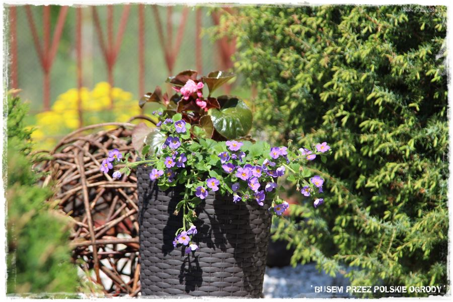 Natomiast ten ogród, ja wspomniałem, jest zupełnie inny. Urządzony według własnego stylu Właścicieli, z zastosowaniem materiałów i rozwiązań, które im przypadły do gustu. Jednak na to wszystko nakłada się jeszcze jeden, zdecydowany wyróżnik. To wszechobecne dekoracje oraz roślinne aranżacje, które są pasją Właścicielki ogrodu – Joli. Z wykształcenia i zamiłowania jest florystką, tworzy piękne bukiety i tą pasję przenosi również do swojego ogrodu. Stąd dosłownie na każdym kroku widoczne są różnego rodzaju dekoracje, przemyślnie zaaranżowane i obsadzone.
