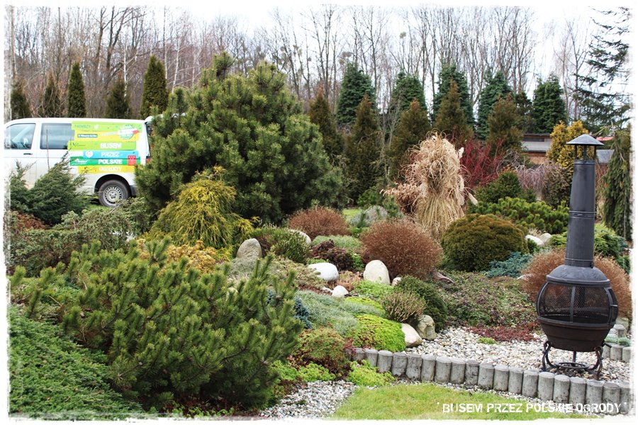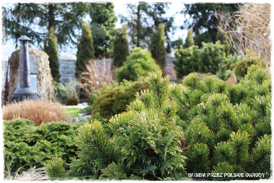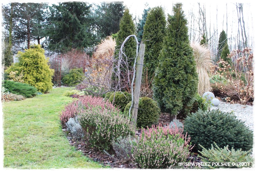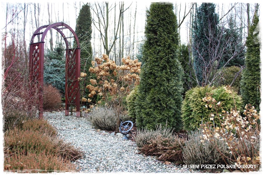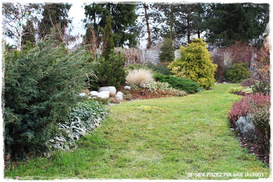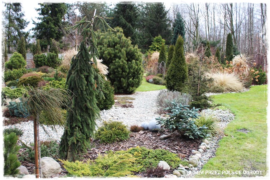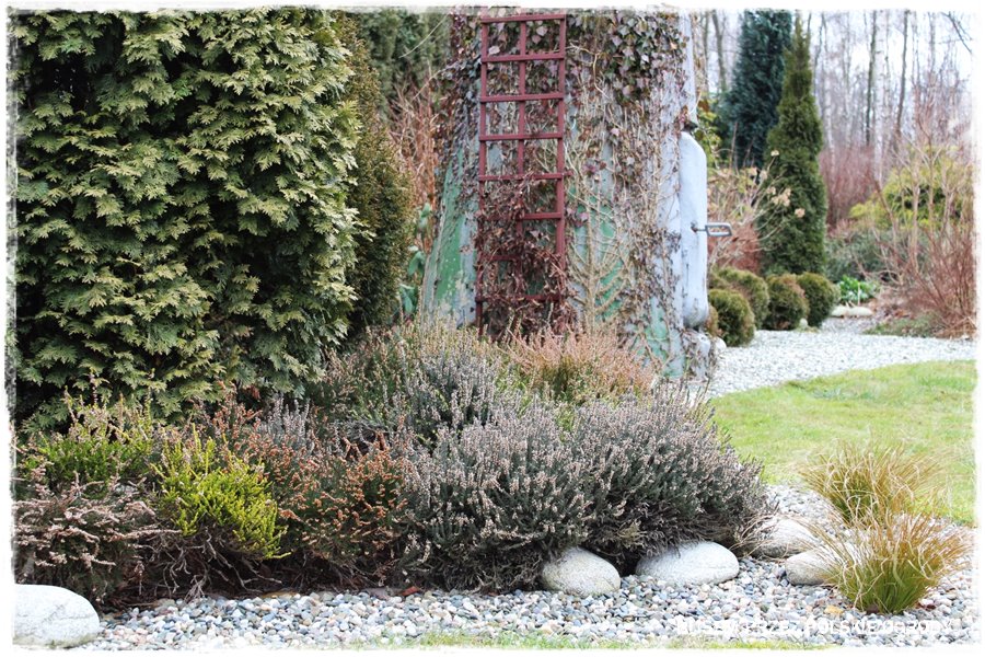 Za ten sukces odpowiada przede wszystkim odpowiedni dobór roślin, wśród których dominują gatunki iglaste, poza tym ich odpowiednie rozmieszczenie, a także niebywała dyscyplina w tym zakresie…. Czyli nie uleganie pokusom, aby sadzić ‘wszystko i wszędzie’ i w każdym możliwym kolorze. Oczywiście poza iglastymi są też inne, niemniej odpowiednio wkomponowane i rozmieszczone, aby właśnie w ich okresie małej atrakcyjności (bezlistnym), nie tworzyły pustych, mało atrakcyjnych stref w ogrodzie. Jednak po kolei.