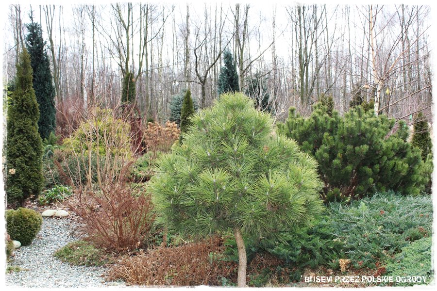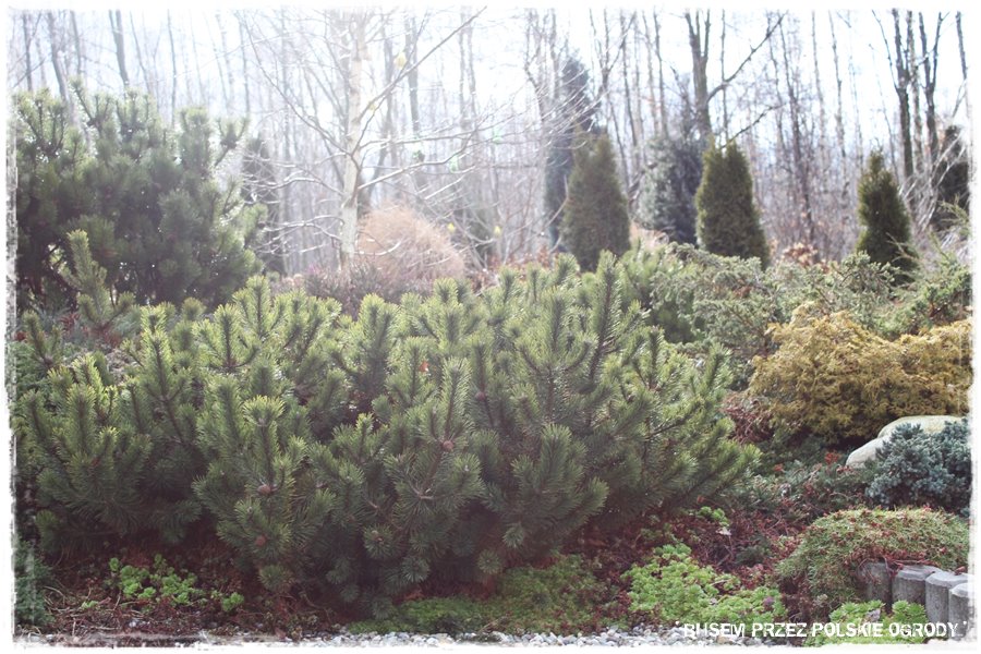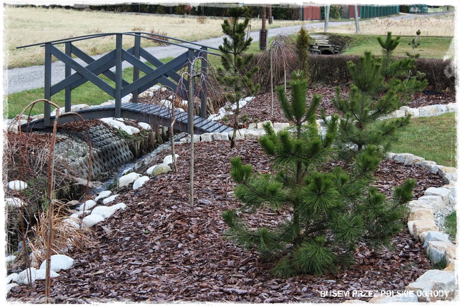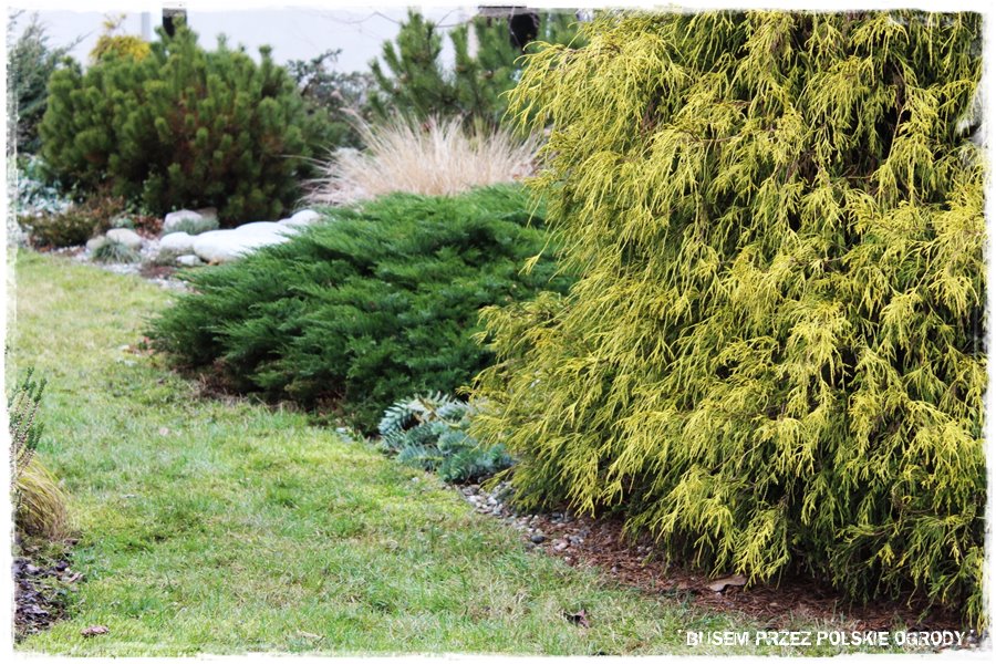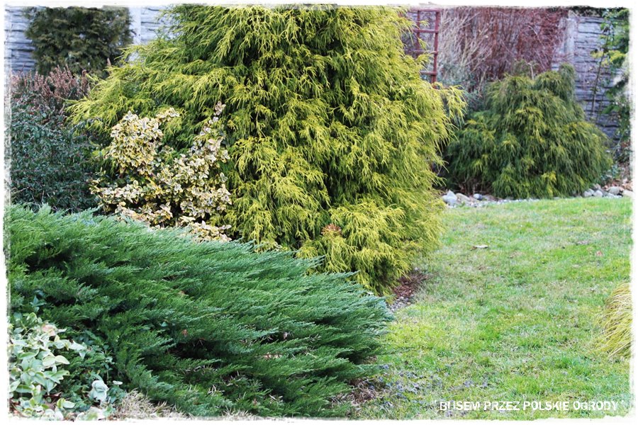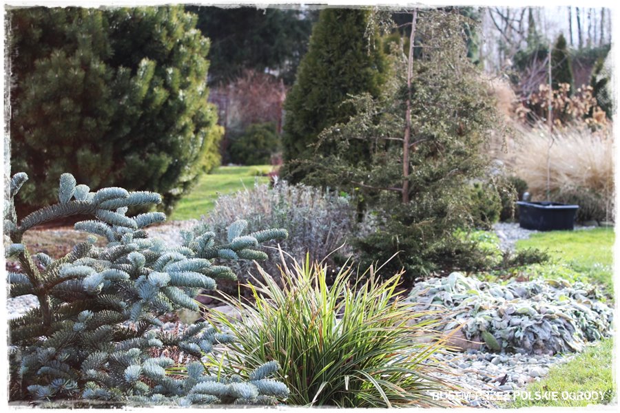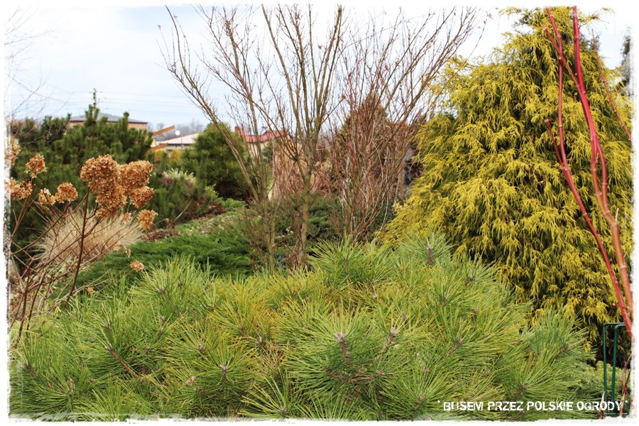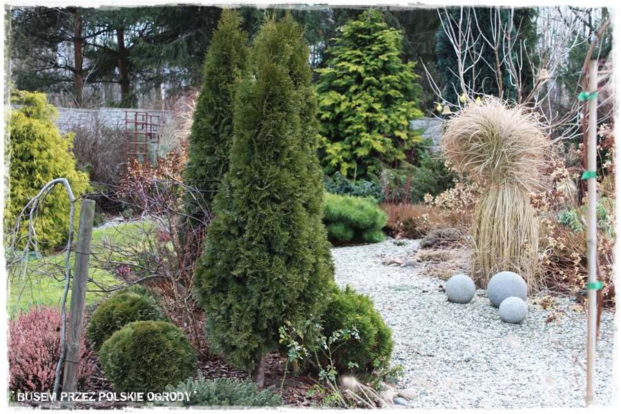 Za ten sukces odpowiada przede wszystkim odpowiedni dobór roślin, wśród których dominują gatunki iglaste, poza tym ich odpowiednie rozmieszczenie, a także niebywała dyscyplina w tym zakresie…. Czyli nie uleganie pokusom, aby sadzić ‘wszystko i wszędzie’ i w każdym możliwym kolorze. Oczywiście poza iglastymi są też inne, niemniej odpowiednio wkomponowane i rozmieszczone, aby właśnie w ich okresie małej atrakcyjności (bezlistnym), nie tworzyły pustych, mało atrakcyjnych stref w ogrodzie. Jednak po kolei.