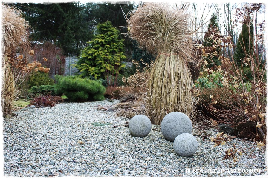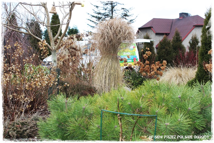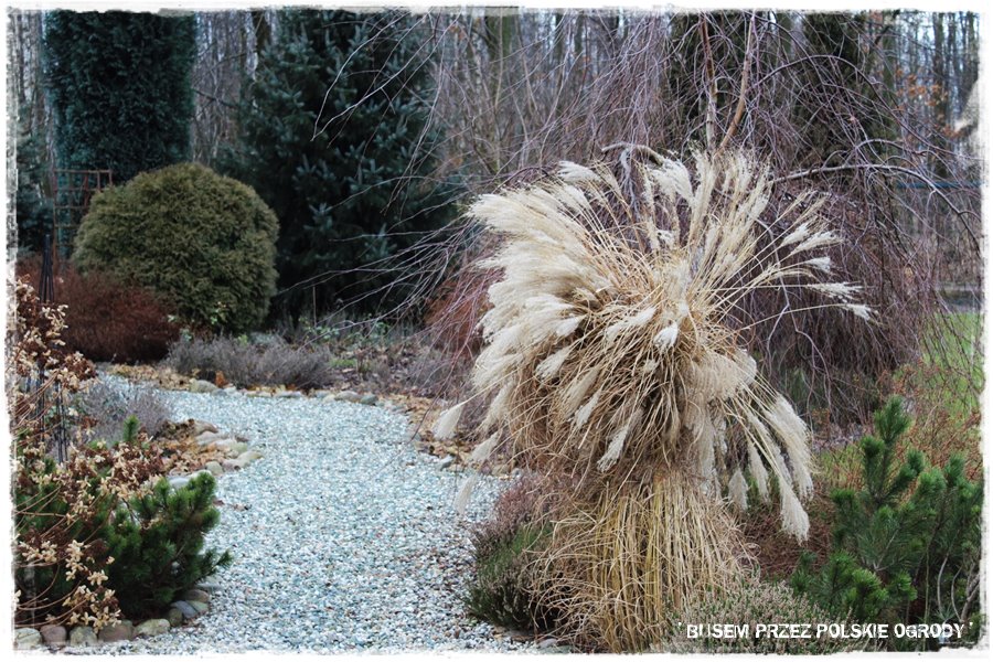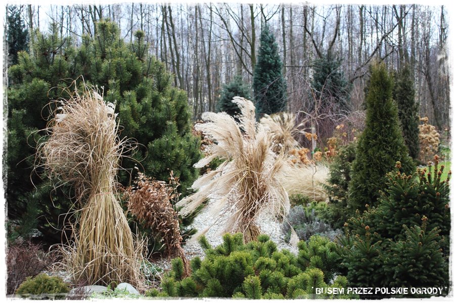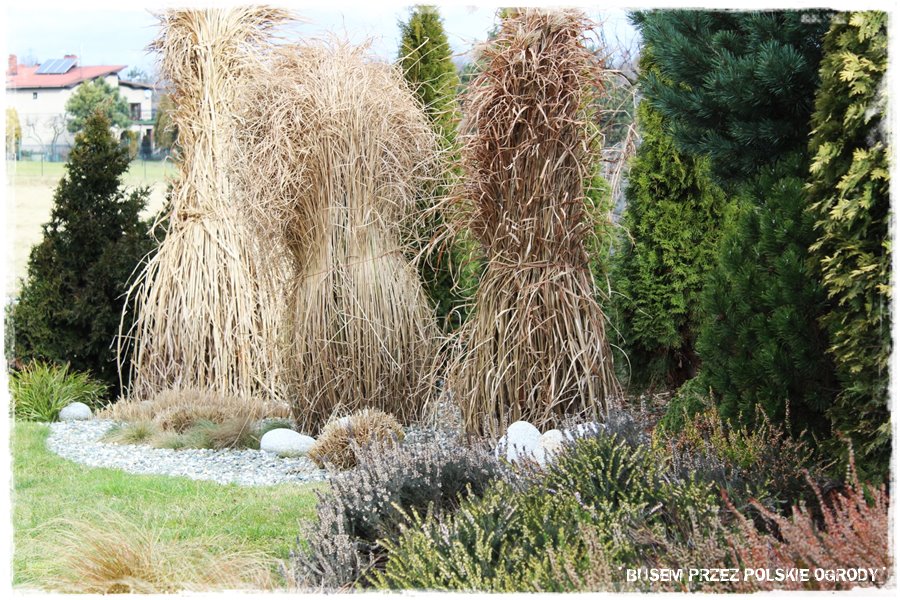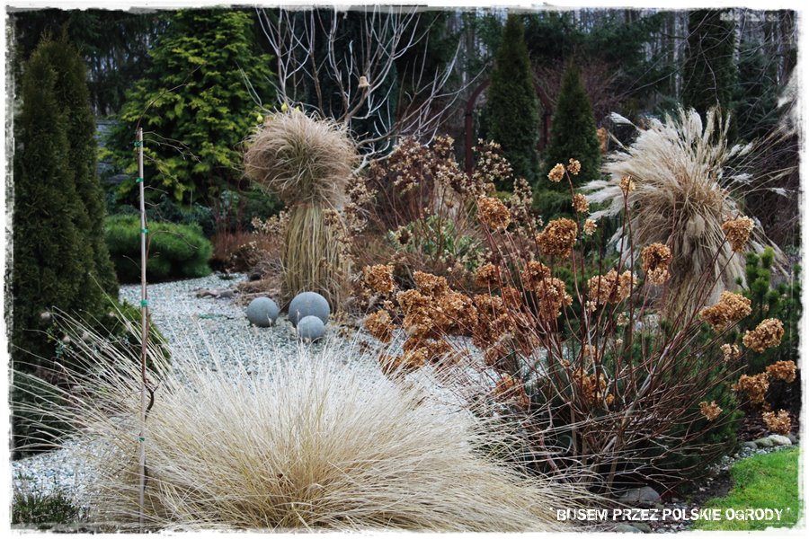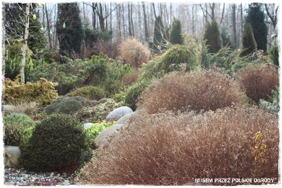 Jak wspomniałem wcześniej, ten ogród to oczywiście nie tylko iglaki. Jest sporo odmian roślin sprytnie w nie wkomponowanych, niemniej na szczególną uwagę zasługują dwie. Pierwsza z nich to trawy ozdobne, którym Właścicielka poświęca szczególną uwagę. Jak zobaczysz na poniższych zdjęciach, trawy zdobią ogród również zimą, a ze względu na swoją różnorodność robią to na tyle efektownie, że są idealnym uzupełnieniem właśnie dla iglaków. Natomiast odmiany zasuszone wprowadzają do ogrodu dodatkowy kolor, który fajnie kontrastuje z zielenią.