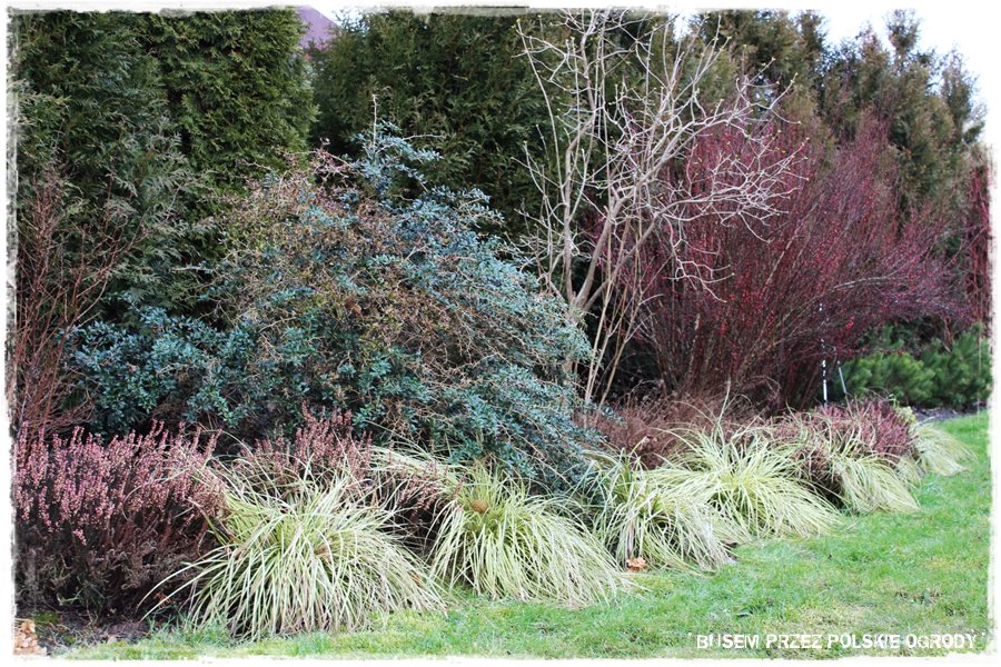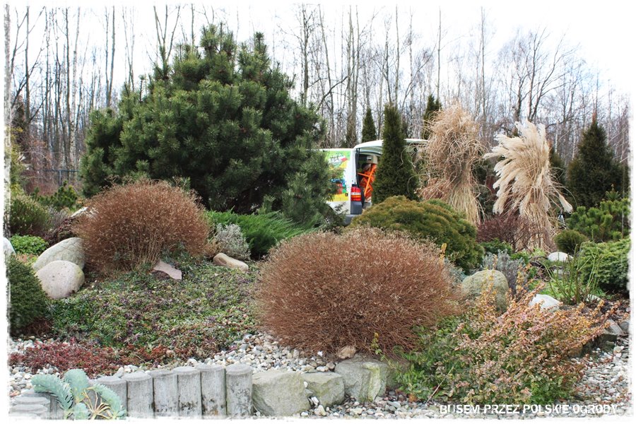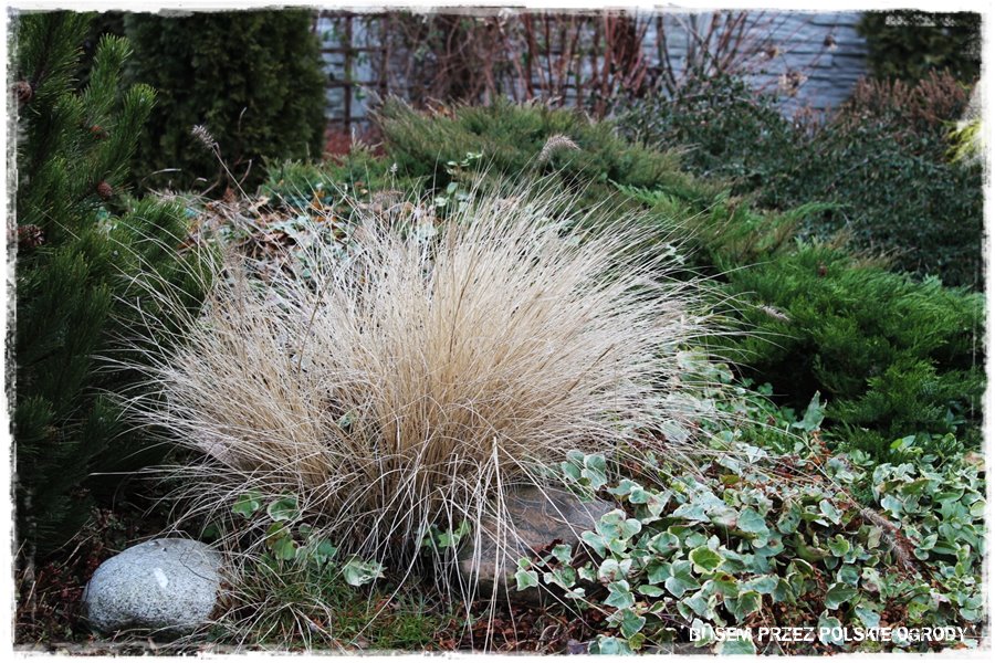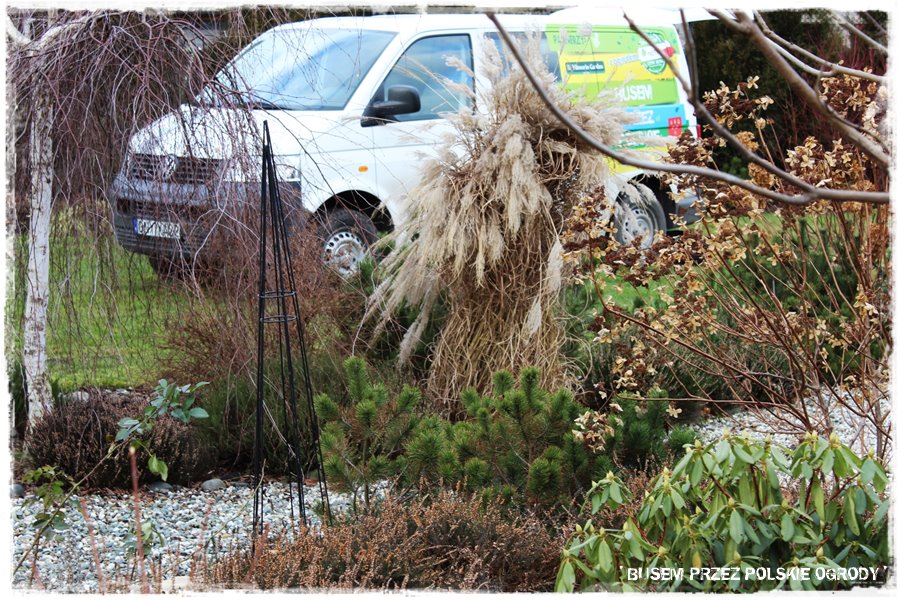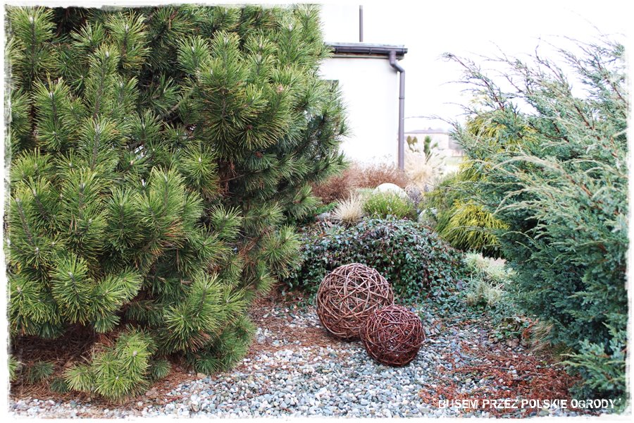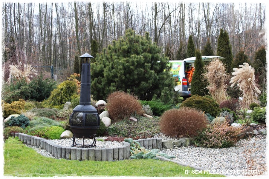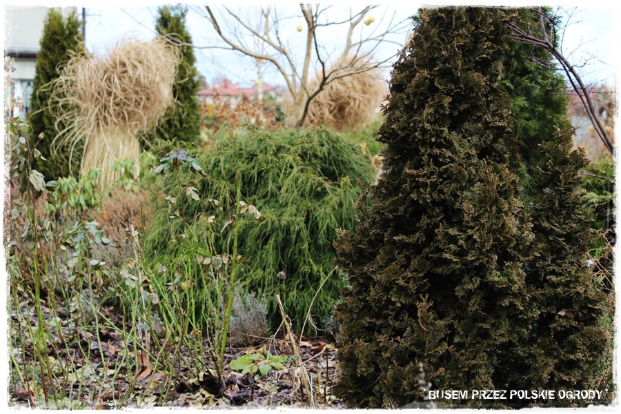 Jak wspomniałem wcześniej, ten ogród to oczywiście nie tylko iglaki. Jest sporo odmian roślin sprytnie w nie wkomponowanych, niemniej na szczególną uwagę zasługują dwie. Pierwsza z nich to trawy ozdobne, którym Właścicielka poświęca szczególną uwagę. Jak zobaczysz na poniższych zdjęciach, trawy zdobią ogród również zimą, a ze względu na swoją różnorodność robią to na tyle efektownie, że są idealnym uzupełnieniem właśnie dla iglaków. Natomiast odmiany zasuszone wprowadzają do ogrodu dodatkowy kolor, który fajnie kontrastuje z zielenią.