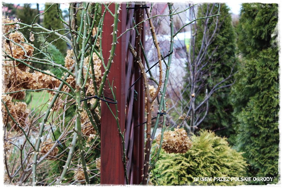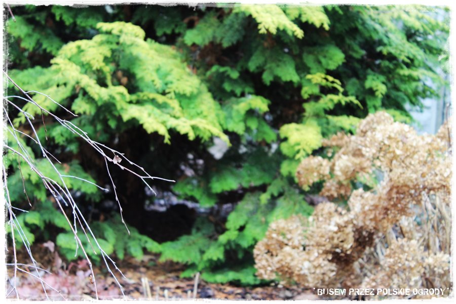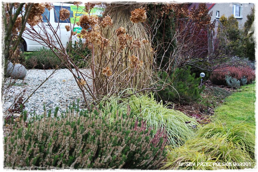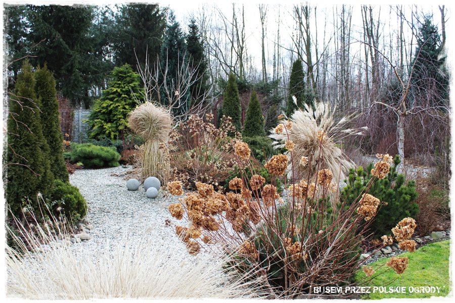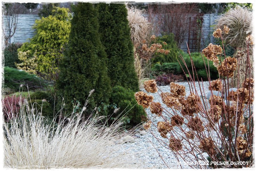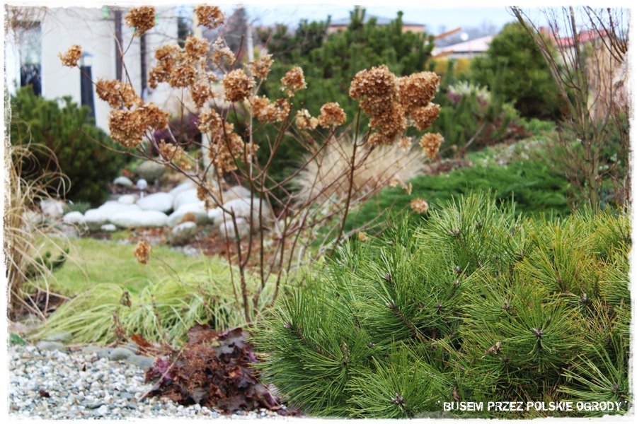 Drugą grupą roślin, które chciałbym podkreślić, szczególnie w tej zimowej odsłonie ogrodu są hortensje. Nie przycięte, zasuszone, również wprowadzają do ogrodu dodatkowy kolor, odcień brązu, który idealnie uzupełnia i kontrastuje z iglakami oraz zasuszonymi trawami.
