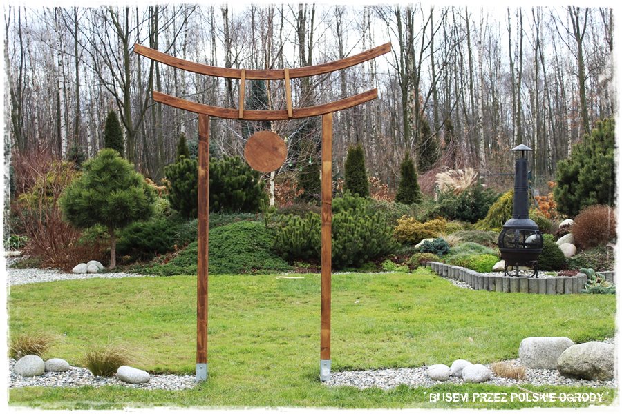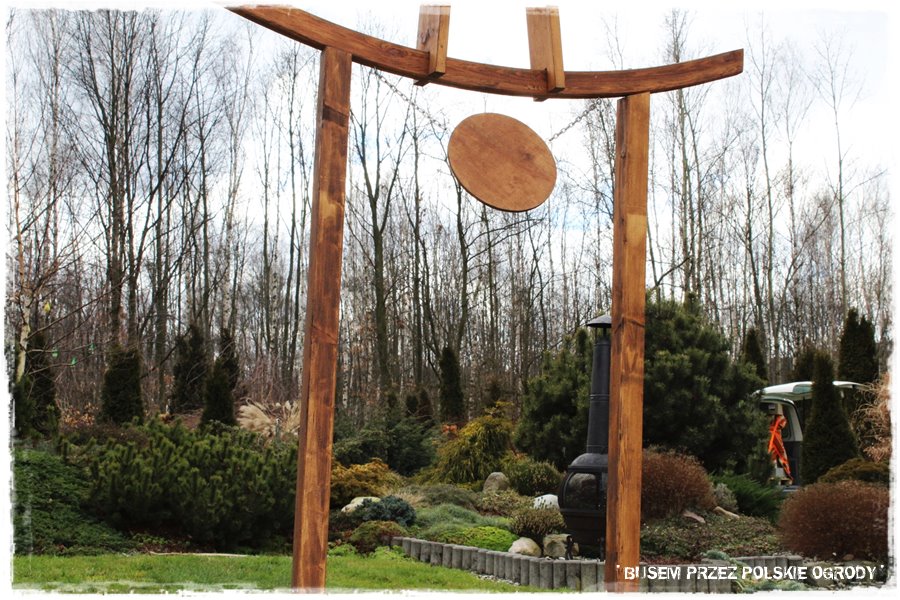 Na szczególną uwagę zasługuje duża, efektowna konstrukcja w stylu japońskim, która ciekawie wygląda na pierwszym planie tylnej strefy działki, czyli wspomnianego, dojrzałego już ogrodu.