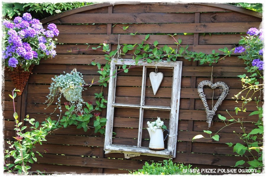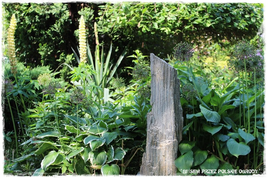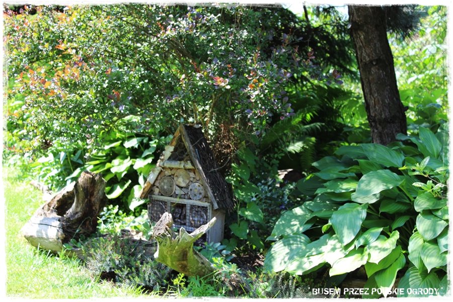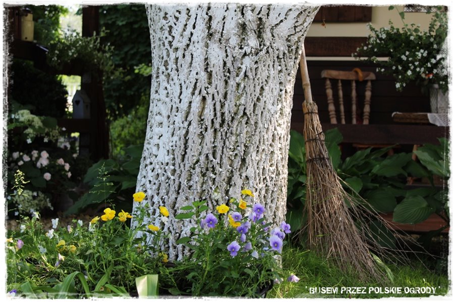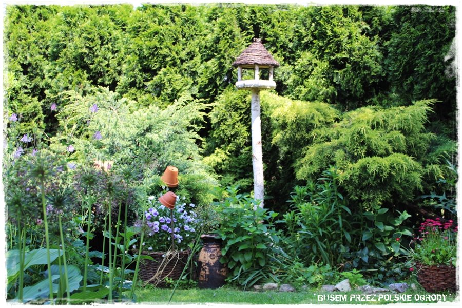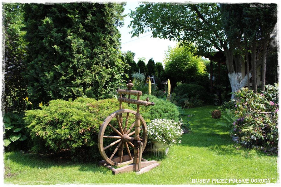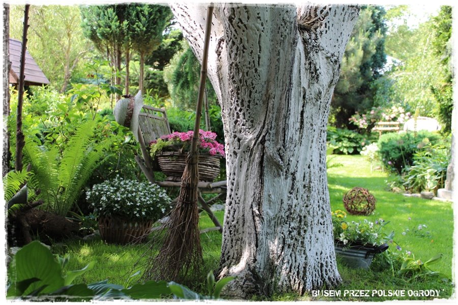 W tym ogrodzie element ten wygląda szczególnie dobrze. Myślę, że jest to zasługą tego dobrego tła, bujnej roślinności i soczystych kolorów. A także tego, że tutaj drzewo nie jest tylko drzewem, ale także wsparciem dla dekoracji.