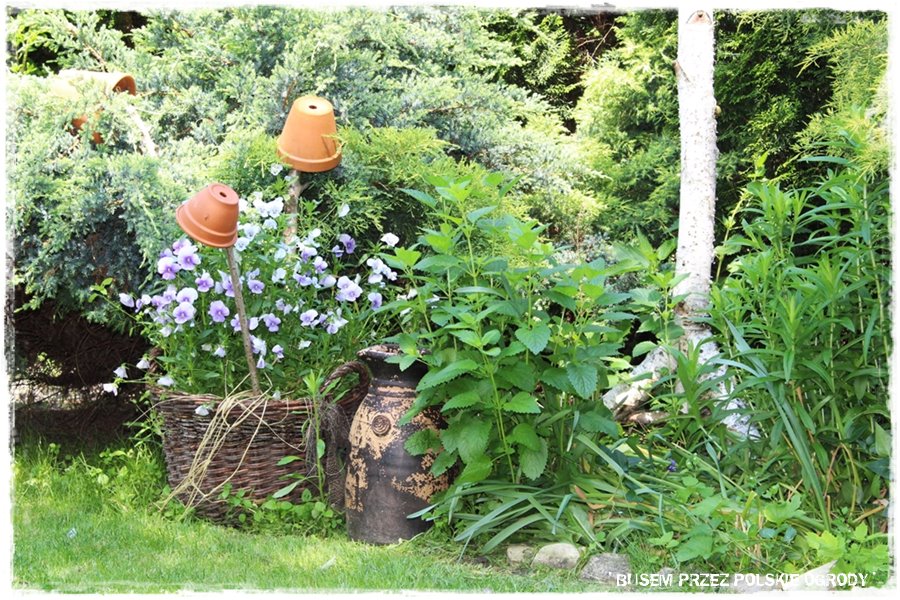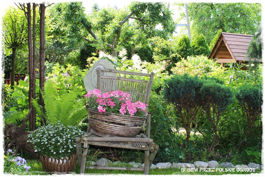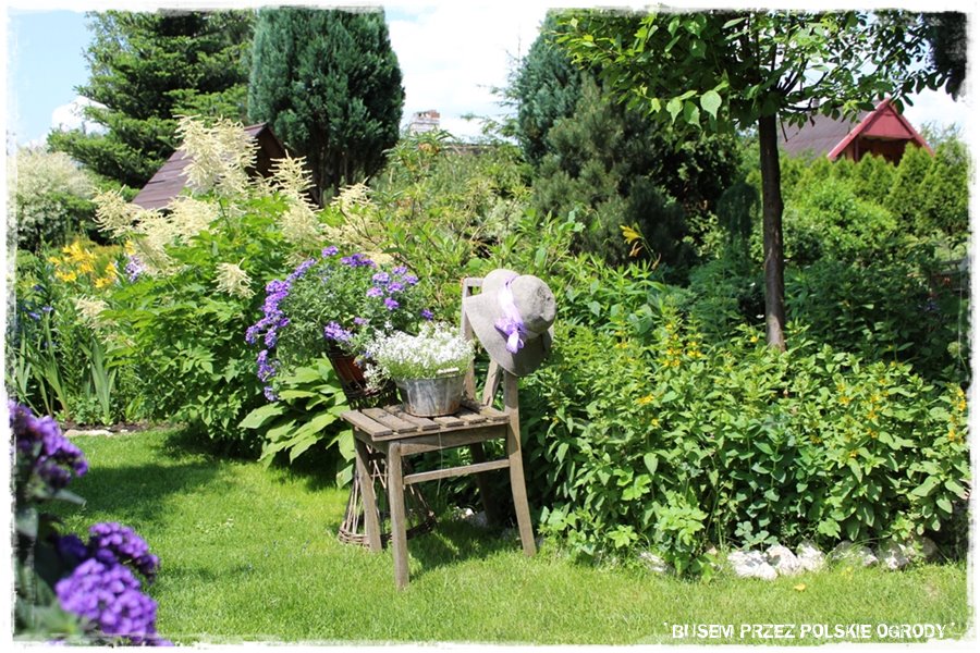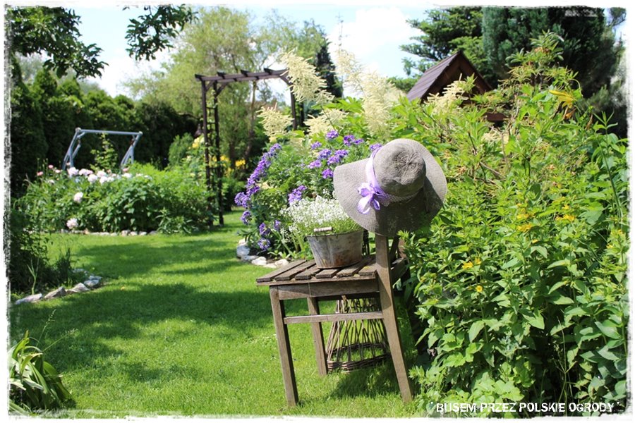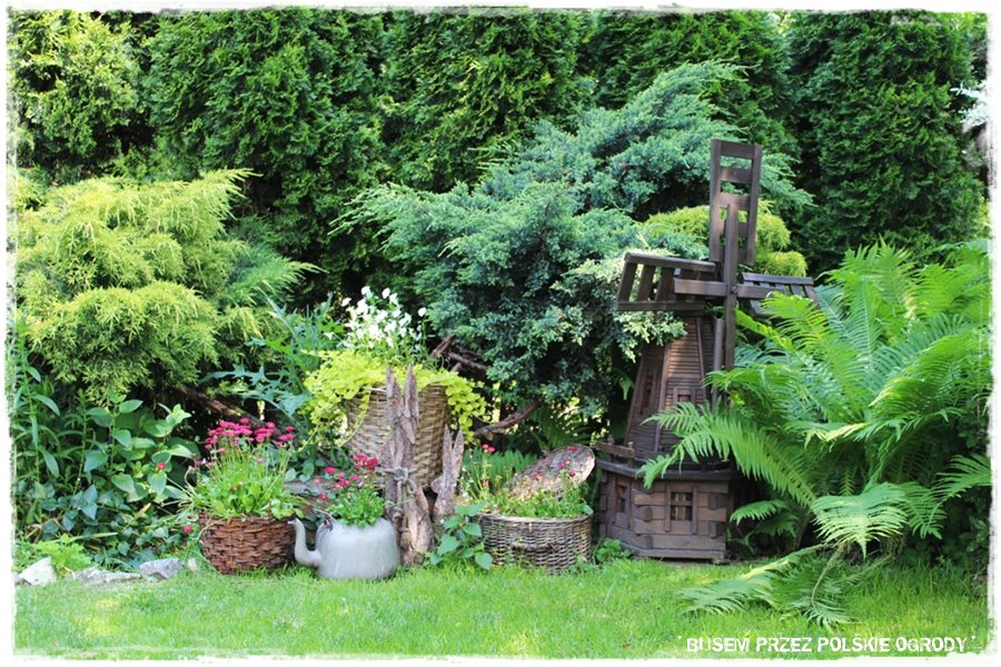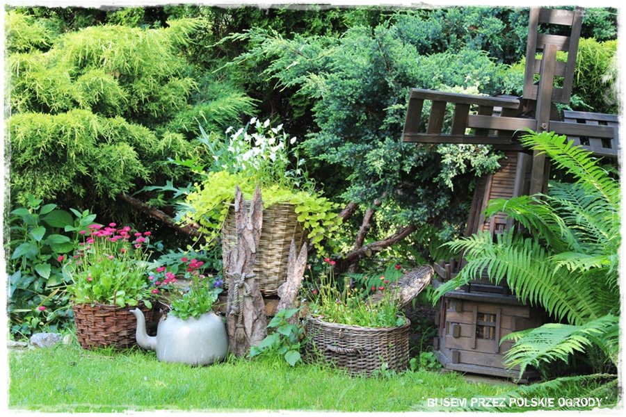 Ten ogród to kwintesencja słów : Małe jest piękne! Wciąż to żonie powtarzam kiedy ją przytulam 🙂 Niby nie wielka powierzchnia ale jak tam swojsko, przyjemnie, nic tylko wziąć kawę, zasiąść w fotelu i delektować się cudownym otoczeniem. Duży plus dla właścicielki za wykorzystanie staroci, drugie życie rzeczy z duszą, które tworzą fantastyczny klimat, to lubimy i my! Przyjemnie jest patrzeć na przedmiot skazany już na szrot u nas zyskuje nową funkcję zdobiąc, biorąc w posiadanie kwiaty które wyglądają wprost bajecznie w takich starych kankach, nieckach, czy chociażby czajnikach po babci jak to żona ostatnio wykombinowała. Tak trzymać, ten ogród wart jest włożonego w niego trudu i na pewno przynosi tyle radości właścicielom co oddaje swego piękna.