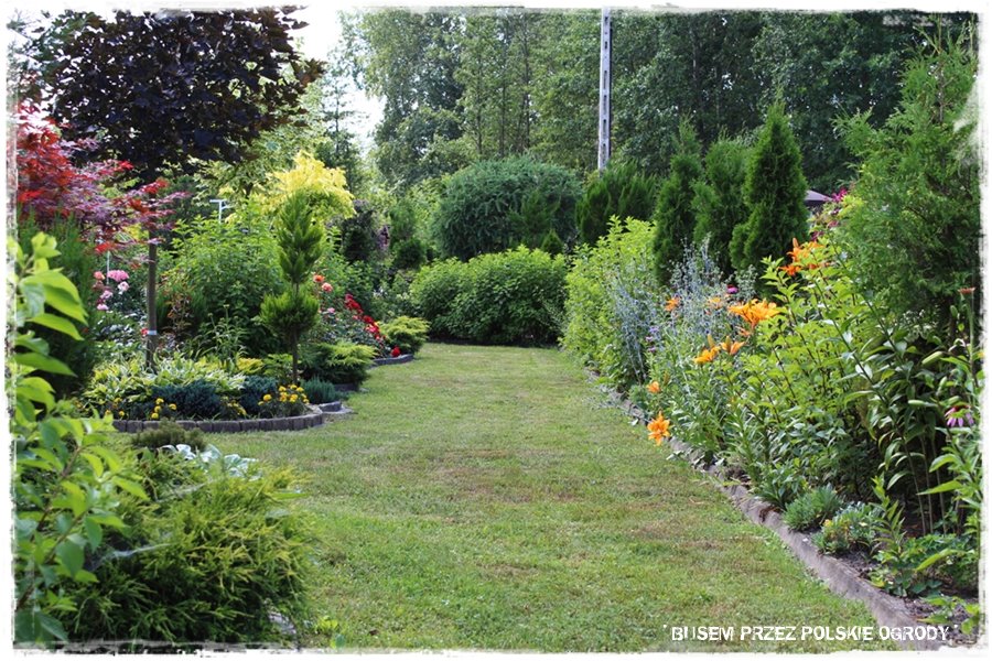 Dopiero po oswojeniu wzroku z tą wielką roślinną mozaiką oraz złapaniu oddechu, w drugim odruchu, można zauważyć, że ta kolorowa przestrzeń, to starannie wypełniony i zaaranżowany układ wijących się rabat, oddzielonych od wypełniającego przestrzeń trawnika. Jest to najlepiej widoczne dopiero po wejściu w głąb ogrodu, gdzie chodząc właśnie “trawnikowymi alejkami”, można z każdej strony podziwiać kolorowe rabaty i wszystko to, co się w nich znajduje.