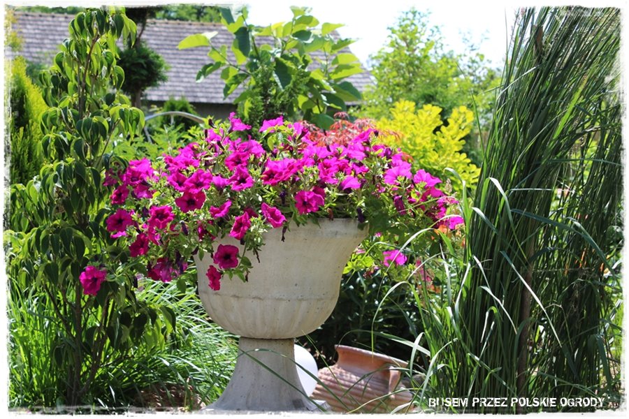 Oczywiście rośliny rosnące na rabatach, czyli mówiąc ogólnie w gruncie, to dla Właścicieli niewystarczające. Stąd też rosną one jeszcze wszędzie indziej, w setkach donic, pojemników i dosłownie gdzie tylko się da. Niemniej szczególnie fajnie wyglądają na specjalnych kwietnikach, kolorowych i fajnie wkomponowanych w rabaty.