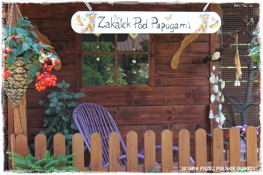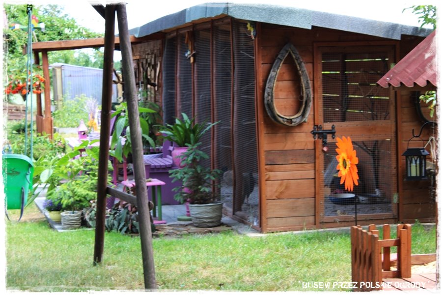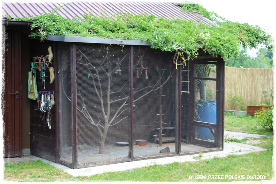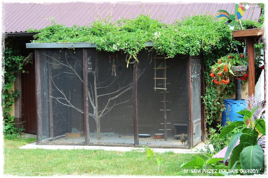 Super fajny element dekoracyjny ogrodu, stosunkowo rzadko spotykany, to woliery dla ptaków. Tu są aż dwie, duże, ładnie wkomponowane, w których mieszkają papugi, bażanty i inne bliżej mi nieznane ptaki. W każdym razie wyglądają efektownie, a całość dopełnia jeden z pokazanych wcześniej kącików wypoczynkowych, z którego można to wszystko podziwiać.