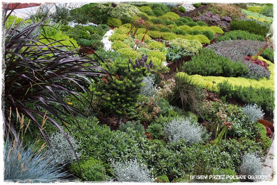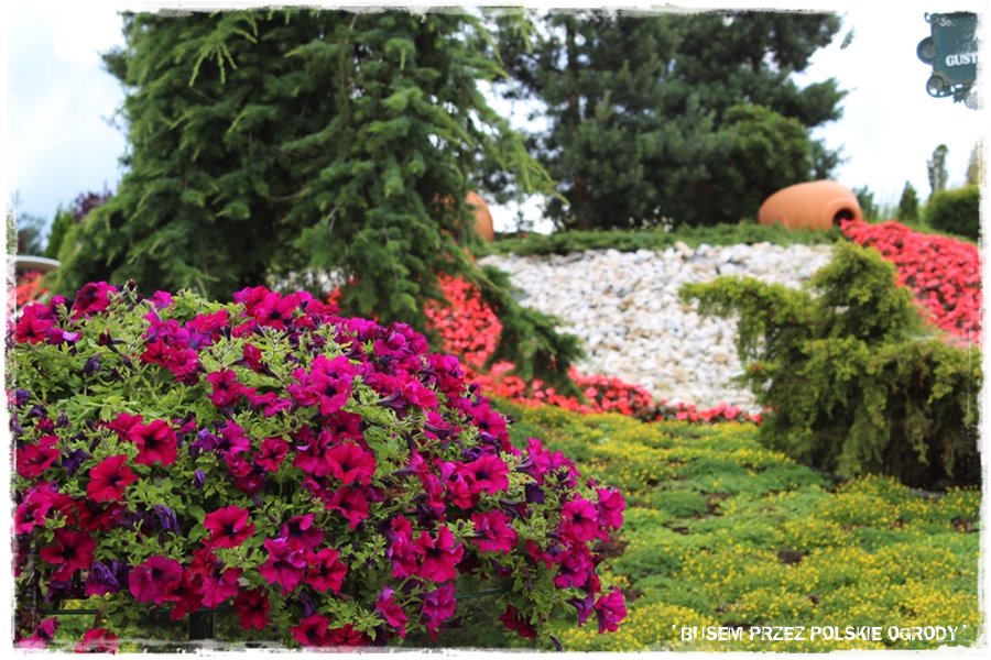 Jeśli zauważyłeś, wymienione dotąd elementy trochę się przeplatają. Bo zacząłem od roślinnych czyli dywany i maty, potem przeszedłem do tych związanych z zagospodarowaniem tzn. strumienia i ciekawych konstrukcji. Jest to trochę celowe, ale trochę również z konieczności. Dlatego, że wszystko to się tak przeplata, ogród jest tak bogaty zarówno w rośliny jak i elementy ciekawej architektury, że ciężko to jakoś wyodrębnić i osobno omawiać. Podobnie jest właśnie z kompozycjami w donicach i na kwietnikach, które łączą w sobie właśnie rośliny, jak również ciekawe elementy. Jednak co to jest i jak wygląda, znajdziesz już w drugiej części tego postu, o czym wspomniałem na wstępie, dzieląc go ze względu na obszerny materiał zdjęciowy.