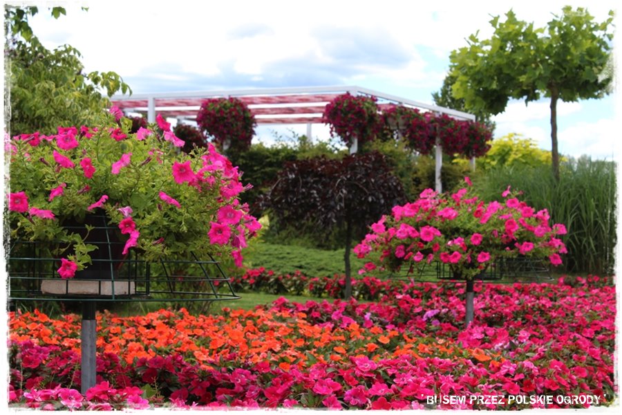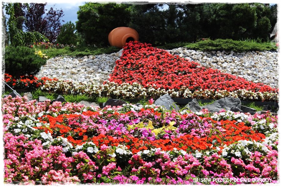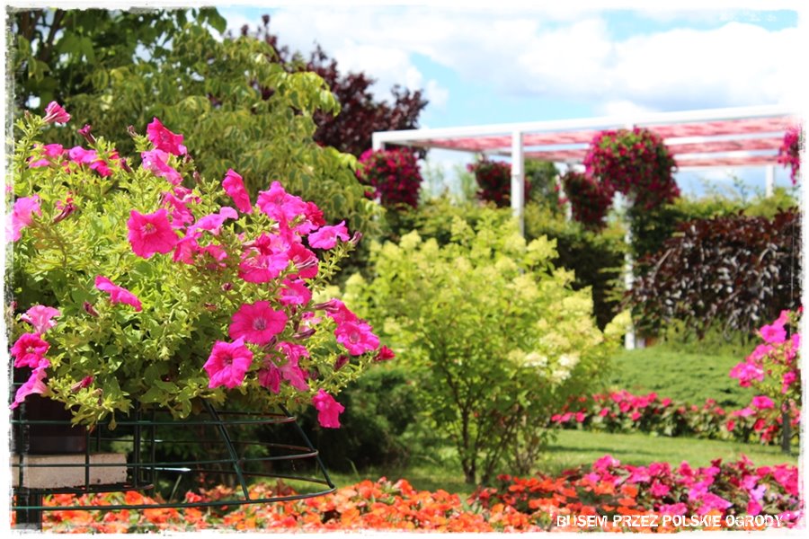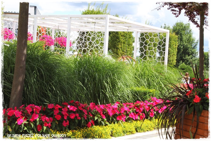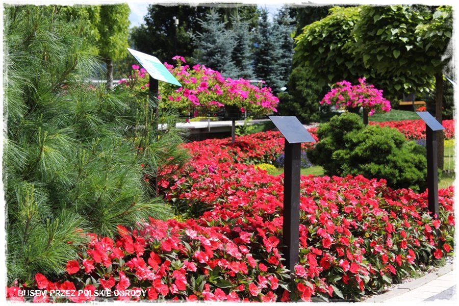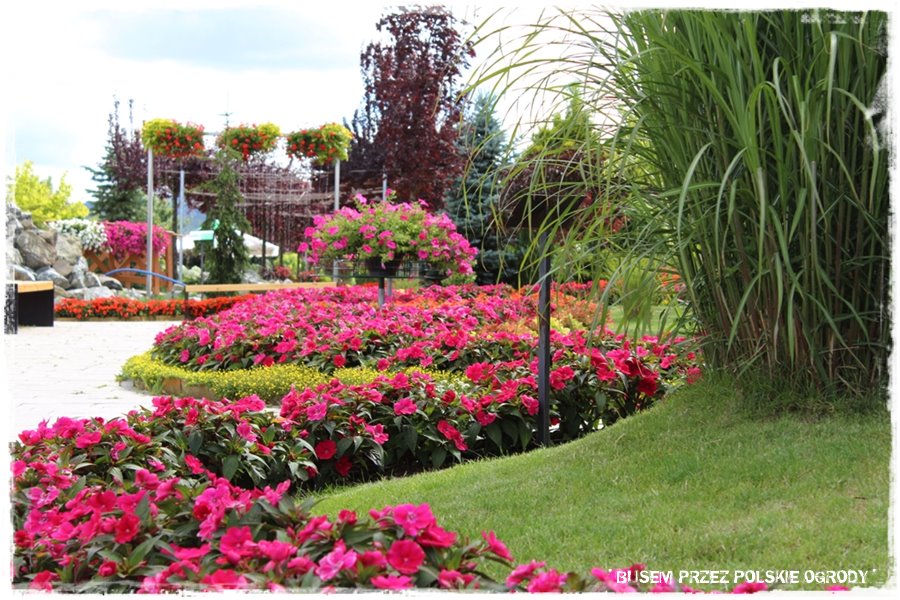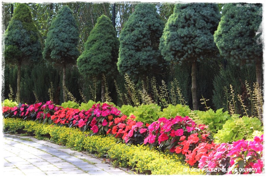 To co w tym ogrodzie jako pierwsze rzuca się w oczy i zdecydowanie wychodzi na pierwszy plan, to niesamowite kolory i ogromne połacie kwietnych kompozycji. Pięknie wpisane w ukształtowanie terenu oraz skomponowane z roślinami wieloletnimi i trawnikami oraz elementami architektury. Królują w nich niecierpki, co jeszcze bardziej podkreśla fakt, jak perfekcyjnie teren jest utrzymywany. Jak mówi sam Właściciel, niecierpek bez wody „udaje trupa“, co w wolnym tłumaczeniu oznacza, że zwyczajnie nie wygląda dobrze. Tymczasem tutaj, mimo pełni lata, wszystko prezentuje się kwitnąco.