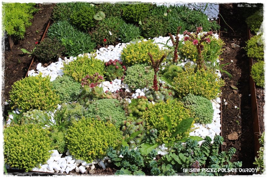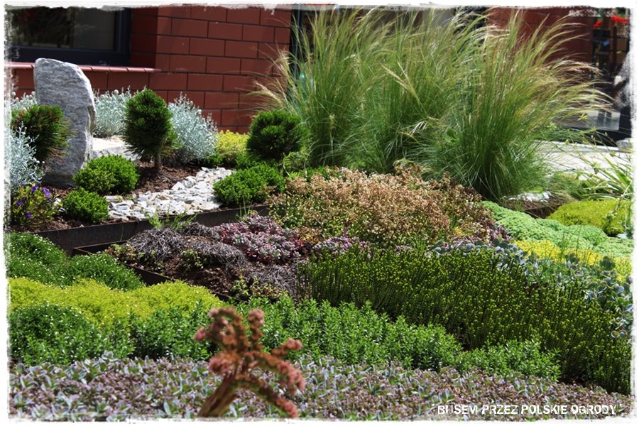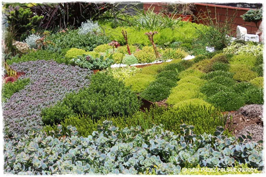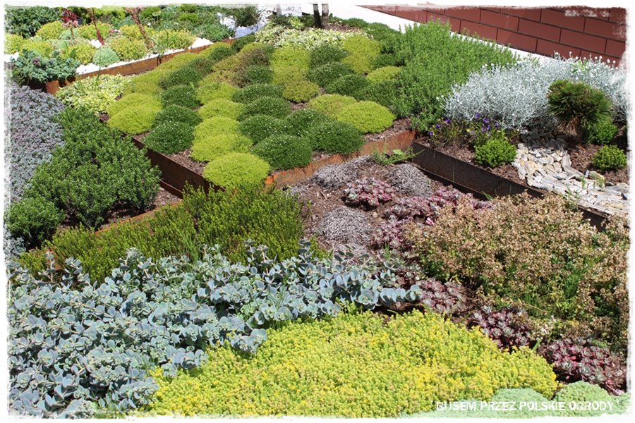 Zupełnie inny rodzaj roślin i kompozycji to bylinowe maty, a właściwie mini, płaskie donice, tworzące coś w rodzaju skalniaka. Fajnie zaaranżowane małymi bylinami, trawami, a nawet miniaturowymi iglakami. Wszystko utrzymane w zielonej tonacji, bardzo ciekawie prezentuje się na tle elewacji budynku i innych części ogrodu.