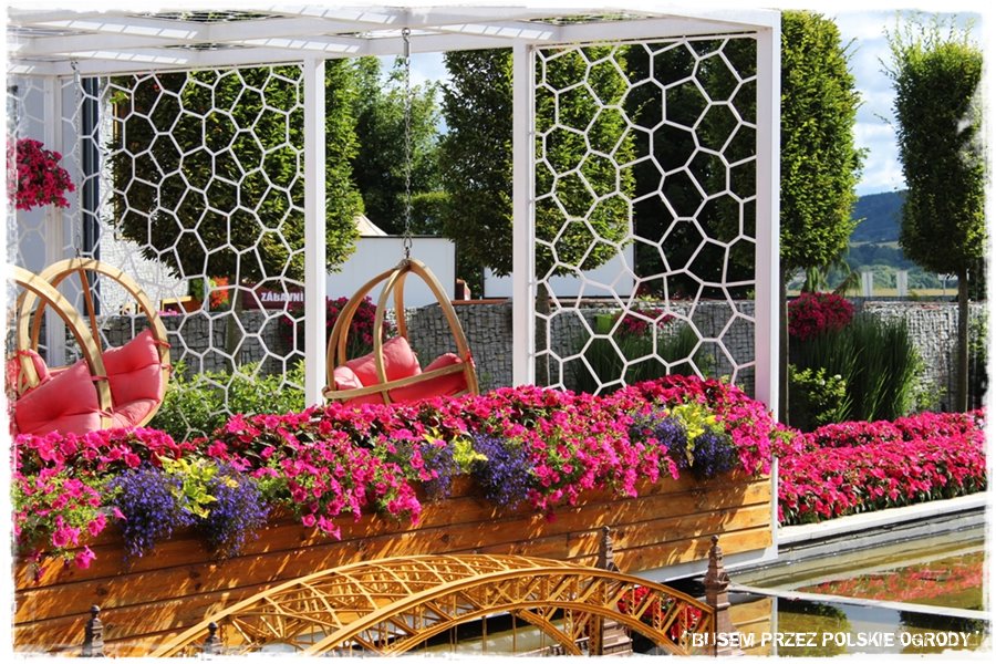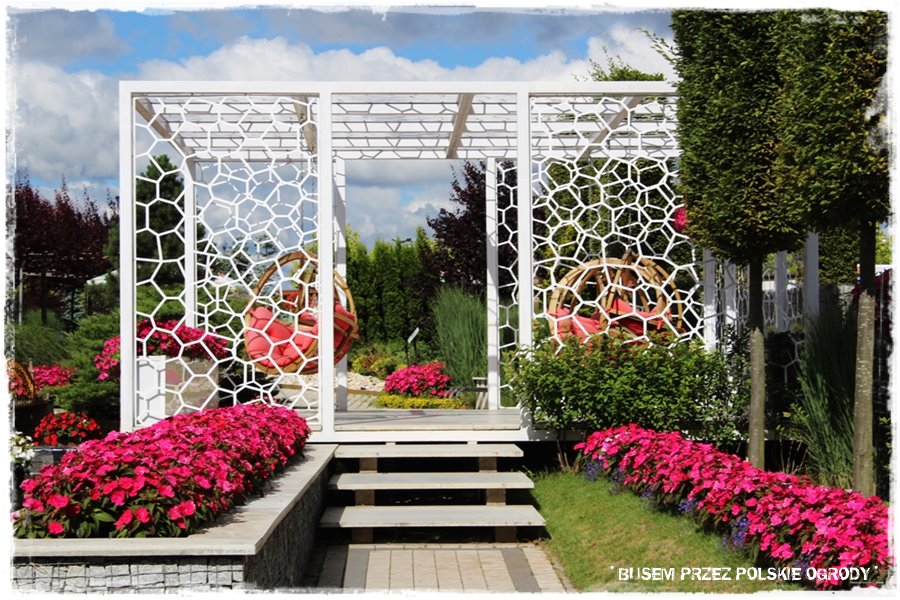 No właśnie. Bo poza wspomnianą altaną nad małym jeziorkiem, w ogrodzie jest cały szereg innych kącików wypoczynkowych, zwieńczonych efektownymi konstrukcjami, pełniącymi częściowo rolę zadaszeń, a częściowo oryginalnych ozdób. Są to konstrukcje zarówno metalowe, jak i metalowe ciekawie łączone z materiałem, ale również naturalne, czyli powstałe przez umiejętne prowadzenie roślin.