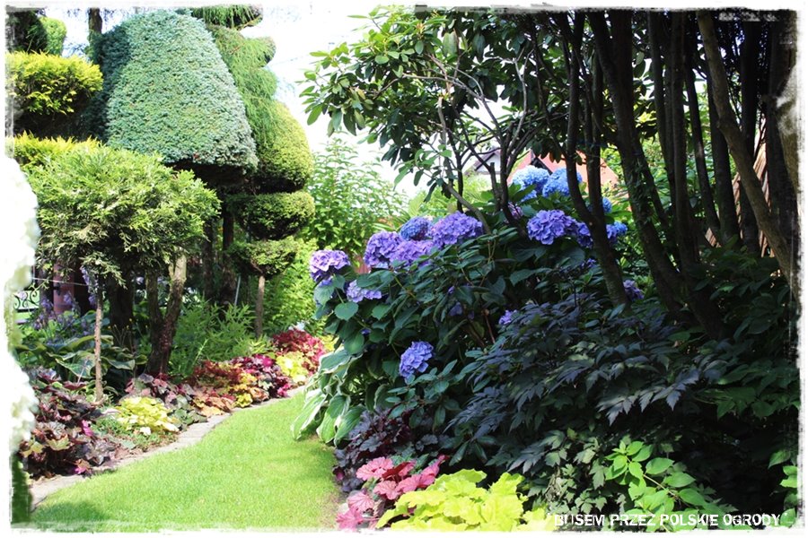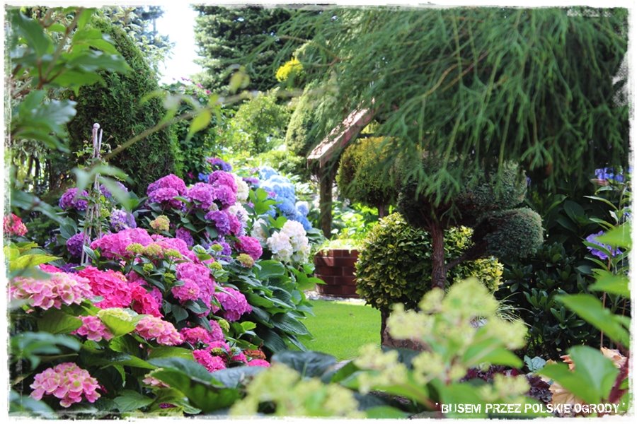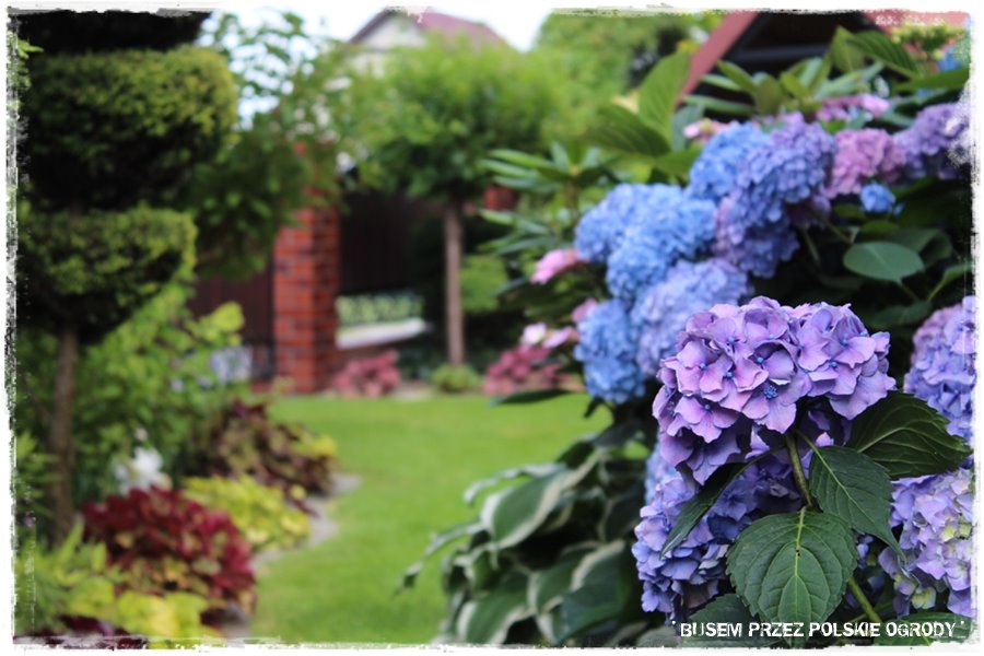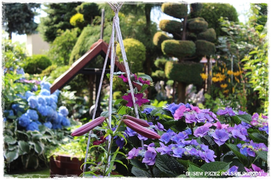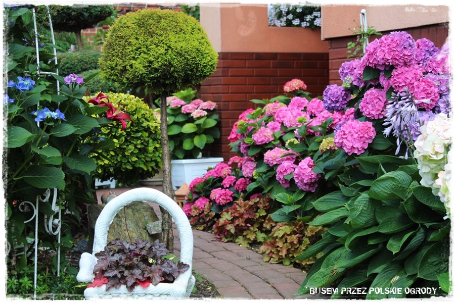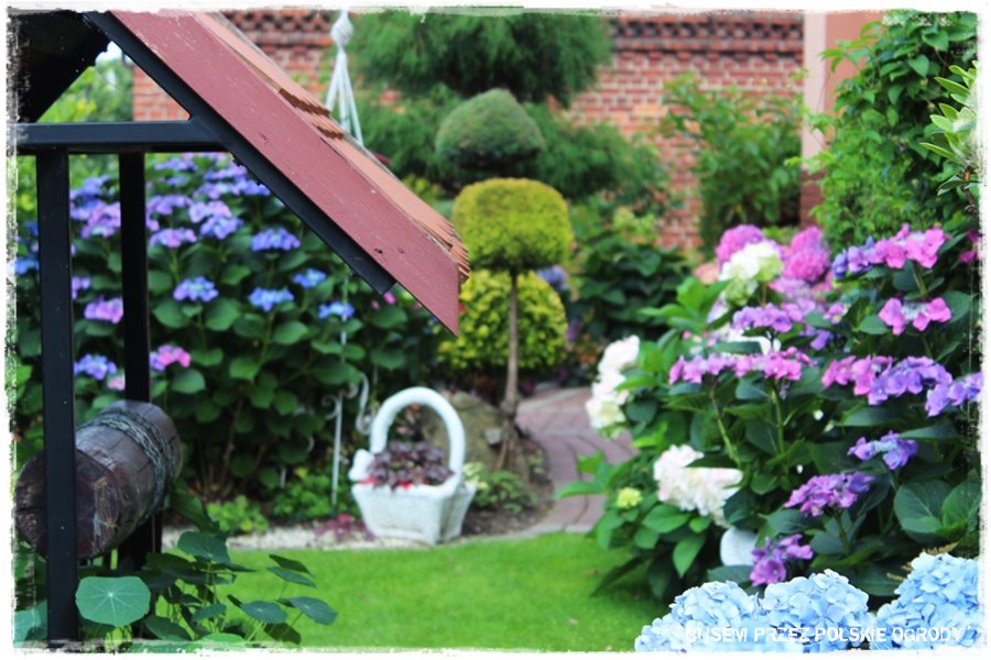 Jak już nadmieniłem, ogród zachwyca roślinami. Jest ich dużo, w różnych odmianach, ciekawie i gęsto nasadzonych oraz skomponowanych. Jednak szczególnie zachwyca kilka grup, a pierwszą z nich są hortensje. Podczas mojej wizyty to był właśnie „ich czas“, stąd zachwycały podwójnie. Pięknie kwitnące, w wielu kolorach i odmianach. Nie wiem jak Grażyna to robi, skąd ma do nich tak dobrą rękę, ale jedno jest pewne: te hortensje są tu wyjątkowe.