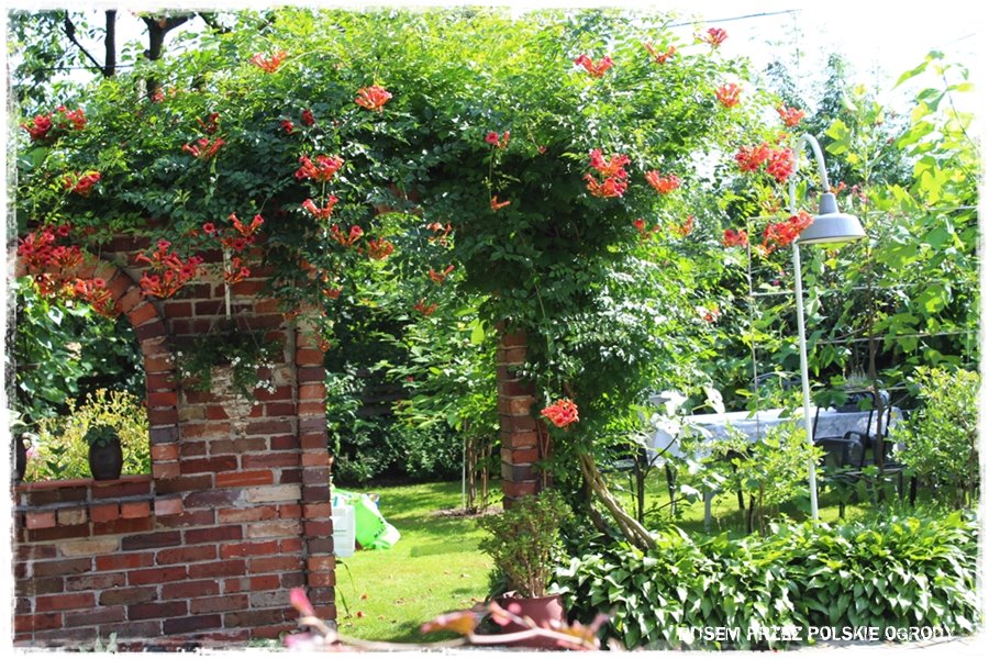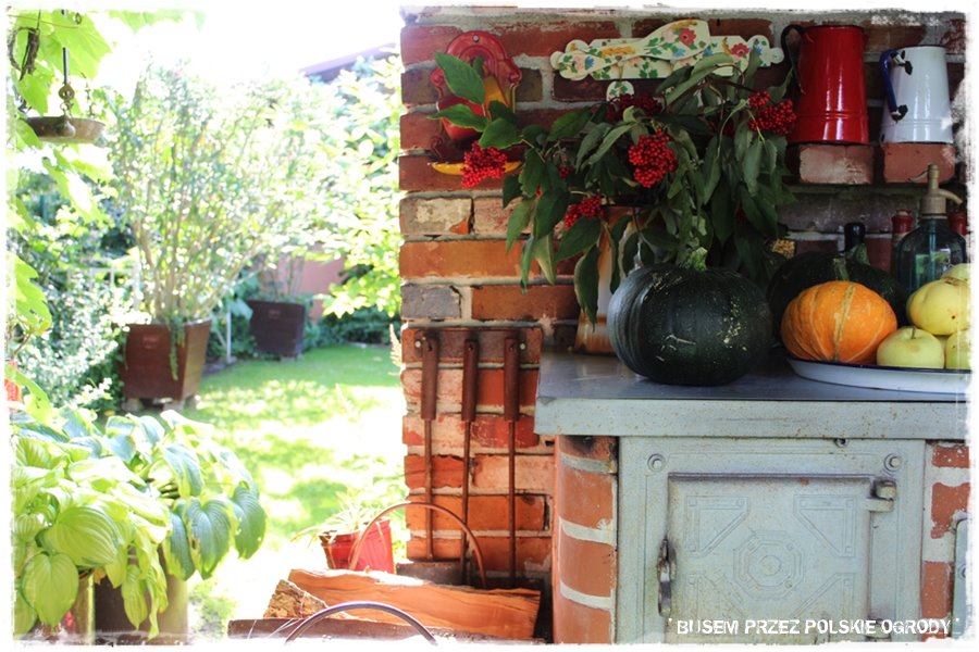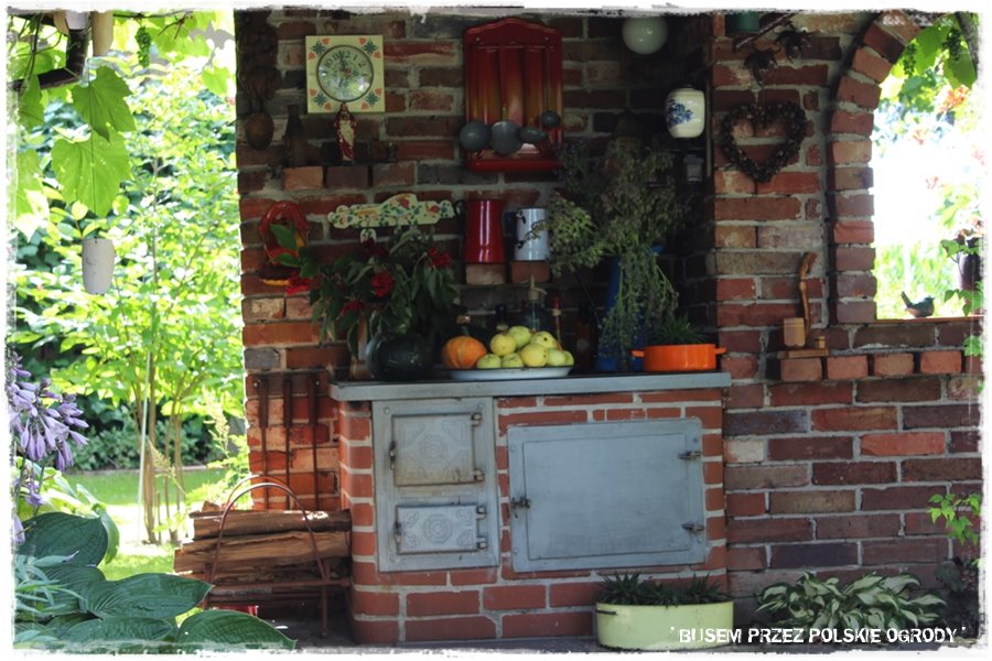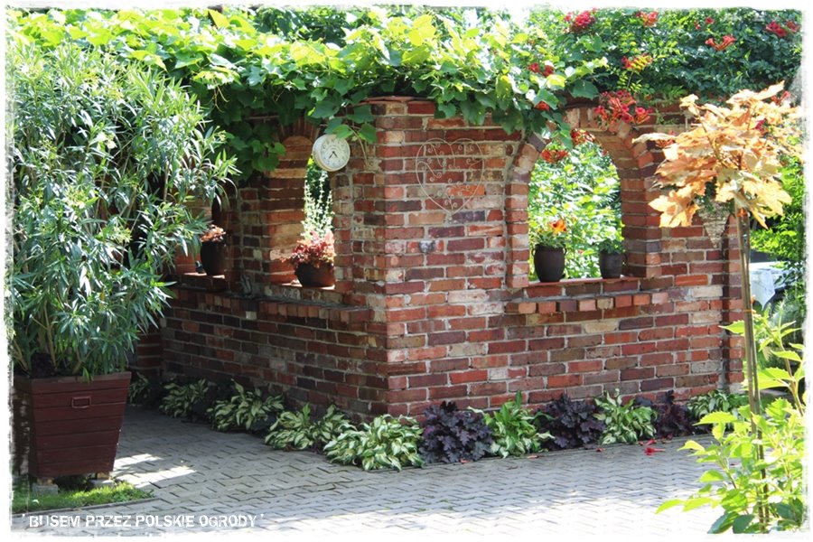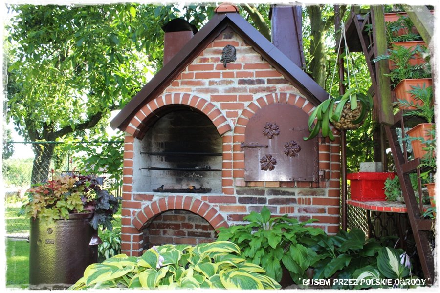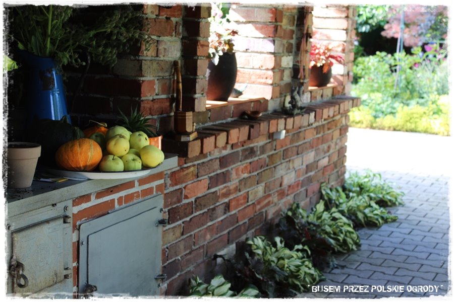 Jak widziałeś w początkowym opisie, ogród poza roślinami, zdecydowanie wyróżniają pewne budowle. Wykonane właśnie z cegły, samodzielnie przez Męża Grażyny. Jest to cały ceglany „kompleks“, będący zarówno efektowną dekoracją, przechodzącą w niesamowitą letnią kuchnię, dalej łączący się z altaną i równie efektowną ceglaną grillo – wędzarnią.