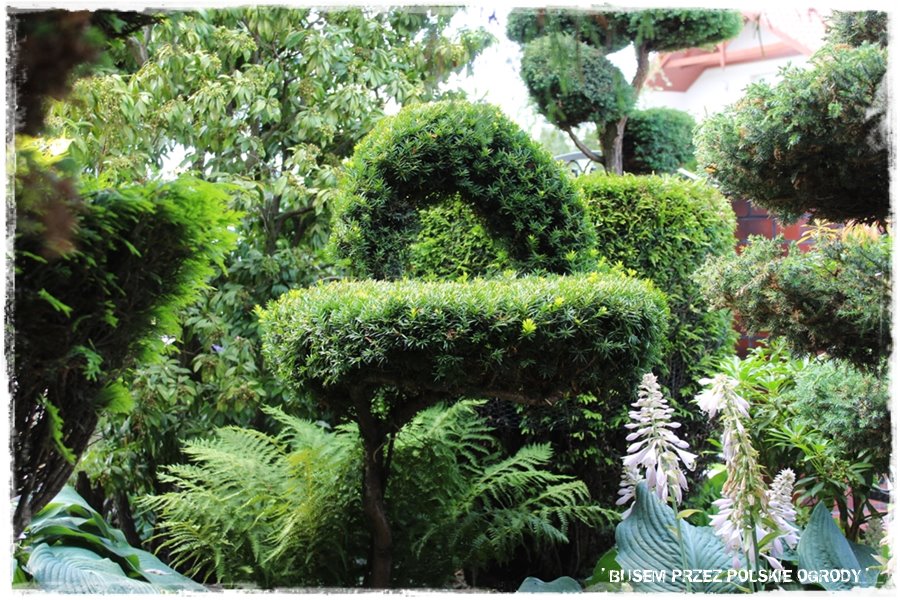 Na szczególną uwagę zasługują również formowane iglaki. Nie są to jakieś wymyśle figury, natomiast precyzja i pracowitość są godne pozazdroszczenia. Jak mówiła Grażyna, niektóre z nich to już prawie trzydziestoletnie okazy, właśnie od takiego czasu prowadzone. Stąd ich kształty stały się prawie naturalne i patrząc na nie, ma się wrażenie, że takie właśnie powinny być.