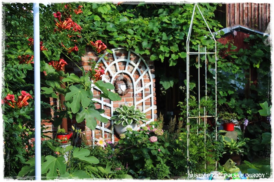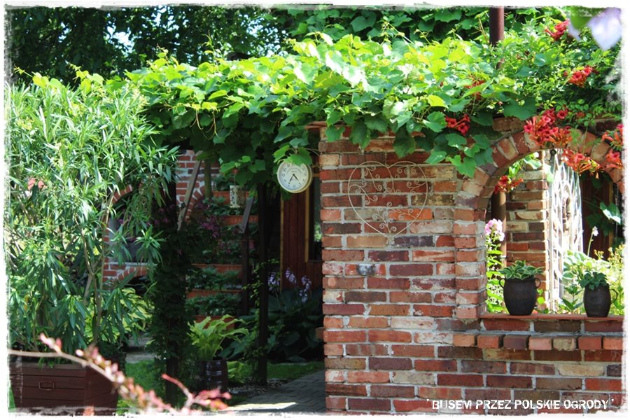 Na koniec wątku ceglanego jeszcze dwa ujęcia, pokazujące, że budowla ta jest zrobiona nie tylko ze względów praktycznych, ale również dekoracyjnych, ciekawie ozdobiona i zaaranżowana. Do tego staranie obsadzona, zarówno wokół, jak i od góry, porastającym ją winobluszczem pięciolistkowym.