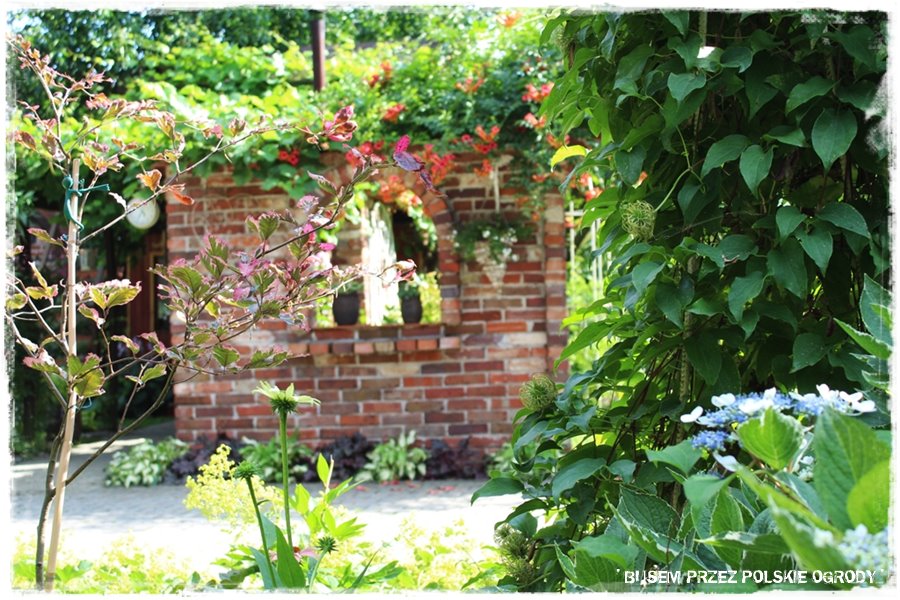 Jednak to nie oddałoby w pełni klimatu tego miejsca. Dla mnie jest ono pod znakiem kwitnących hortenesji oraz pięknych ceglanych budowli, między innymi niesamowitej „letniej kuchni“. Wiem, że nazwa „kwitnąco – ceglany ogród“ może nie jest zbyt szczęśliwa, natomiast w pełni oddaje to, co w tym ogrodzie wychodzi na pierwszy plan. Co prawda wychodzą na niego również żurawki i funkie, ale o tym wszystkim za moment.