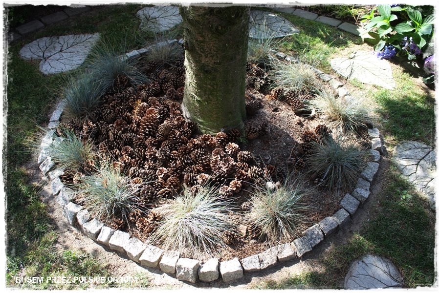 ciekawe mini klomby wokół pni, a wokół nich betonowe odlewy liści, będące ogrodowymi, chodnikowymi stopniami.