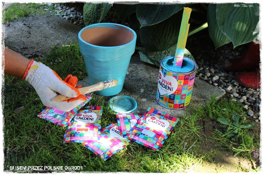 Poza pracami typowo ogrodniczymi, tradycyjnie postanowiliśmy poeksperymentować z farbami, nadając jednej z donic, oryginalny, niebieski kolor. Jestem pewny, że po wyschnięciu idealnie wkomponowała się w tą oryginalną, kolorową, letnią kuchnię.