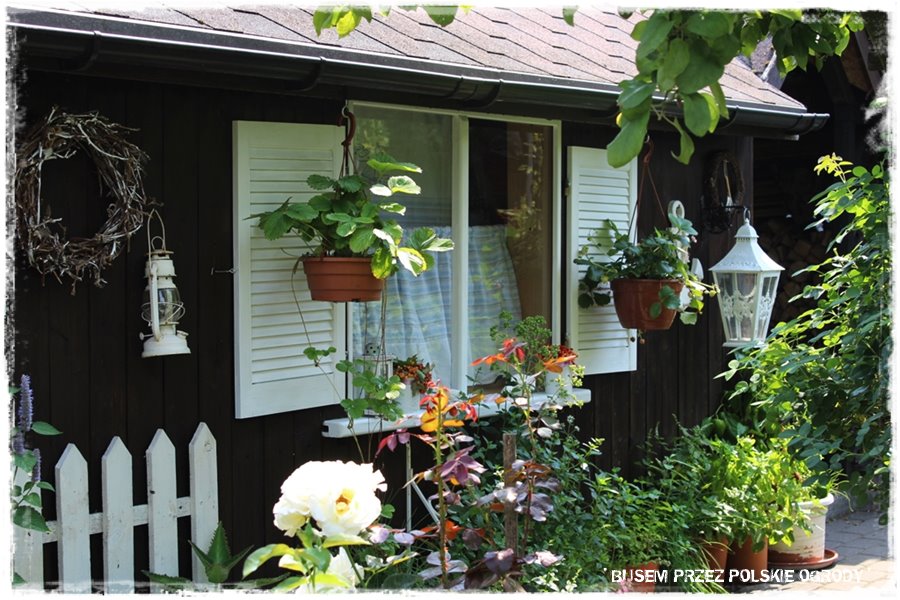 Jak w każdym ogrodzie, również i w tym, nie może zabraknąć domku gospodarczego. W końcu gdzieś te wszystkie ogrodowe rzeczy i narzędzia trzeba przechowywać. A zatem oczywiście jest, ukryty w bocznej części ogrodu i mocno osłonięty roślinami. Jednak nie to jest w nim najciekawsze. Ale to, że jak wszystko w tym ogrodzie, również i domek wykończony jest z wielkim smakiem i elegancją. Białe okiennice i dekoracje sprawiają, że ta teoretycznie „techniczna” budowla, nabiera zupełnie innego charakteru. Poza funkcją, którą spełnia, staje się również efektowną, ogrodową ozdobą.