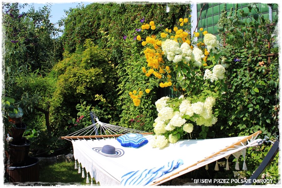 Myślę również, że ukoronowaniem tych roślinnych zakątków jest pięknie wkomponowane i obsadzone oczko wodne, którego praktycznie wcale nie widać. Ale za to dokładnie słychać płynącą i szumiącą wodę, w pobliżu której stoi elegancko zaaranżowany hamak. Moim zdaniem idealne miejsce na ogrodowy relaks.