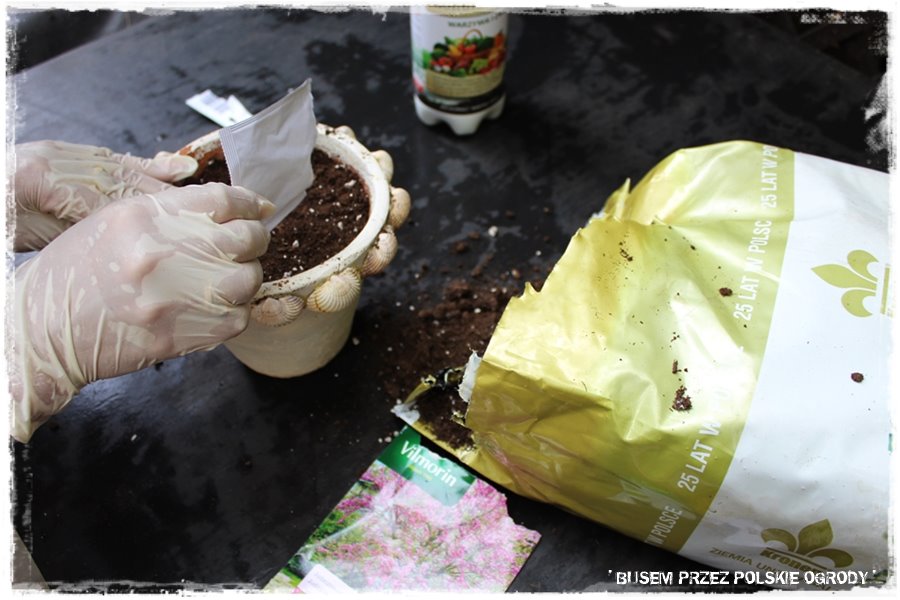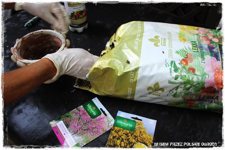 Jak w każdym z odwiedzonych ogrodów, tak i w tym przyszedł czas na wypróbowanie kilku produktów od Partnerów. Tak aby trochę się pobawić, a przy okazji zrobić coś pożytecznego, do tego na świeżym powietrzu i w ogrodzie. Wybraliśmy więc nasiona judaszowca południowego oraz akacji srebrzystej, które posialiśmy w donicach, w sprawdzonym, uniwersalnym podłożu. Myślę, że niebawem Marzena będzie miała z nich pożytek i będzie musiała znaleźć miejsce aby wysadzić je gdzieś w ogrodzie.