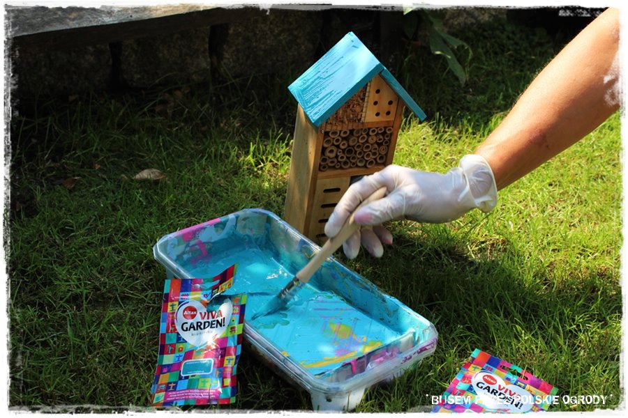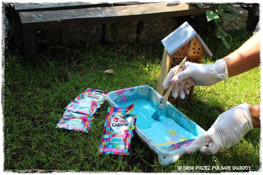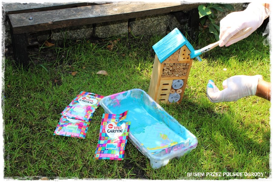 Poza pracami typowo ogrodniczymi, tradycyjnie postanowiliśmy poeksperymentować z farbami. Tym razem wybraliśmy specjalne, jednorazowe saszetki, które zawierają niewielką ilość farby, w sam raz do malowania niewielkich elementów. My zdecydowaliśmy się na pomalowanie daszka w domku dla owadów, który zyskał ładny, niebieski kolor. Swoją drogą dobrze zgra się z innymi, niebieskimi dodatkami tego ogrodu.