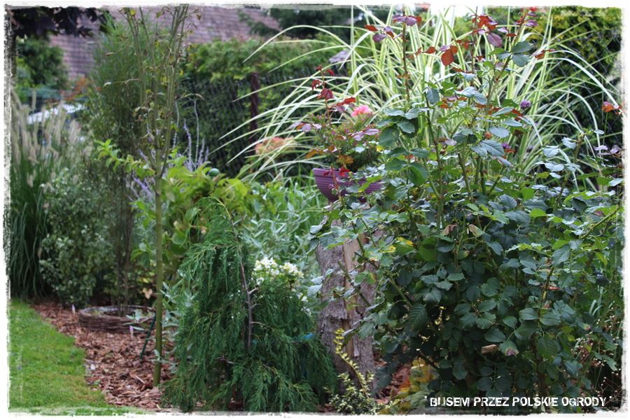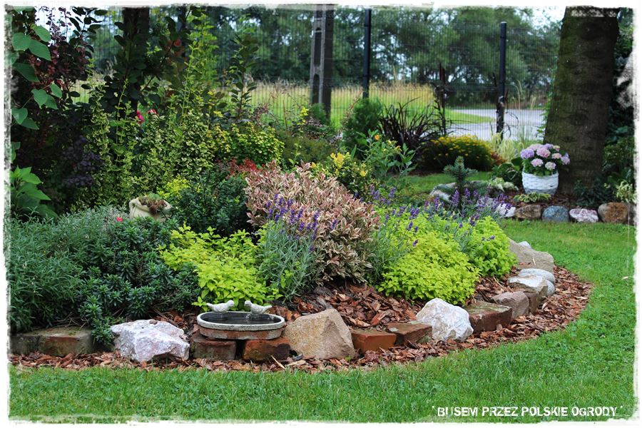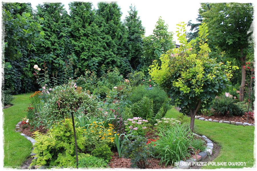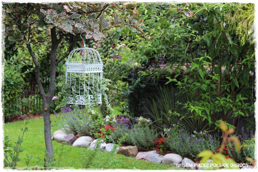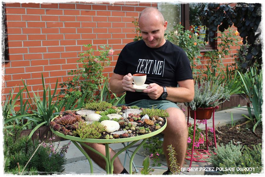 Choć bliskie memu sercu są sielskie ogrody, to ten tutaj bardzo mi się podoba. Przemyślany, bardzo zadbany, mogłabym rzec “ciepły”, ujmujący magią kolorów. Szczególnie przypadł moim myślom niezwykły stolik, w sumie nie tak trudny a jakże dekoracyjny! Muszę pomyśleć nad podobnym zestawem w swoim ogrodzie, byłby niebywałą ozdobą a i jak przyjemnie zasiąść przy nim, postawić na kamyczku filiżankę z aromatyczną kawą i zatopić się w oglądaniu kolejnych przyrostów roślinek. Chyląc czoła właścicielom, dziękuję za pokazanie pięknego ogrodu!