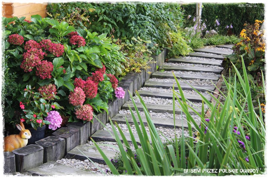 Oryginalne obrzeża i ścieżka ze starych, drewnianych podkładów