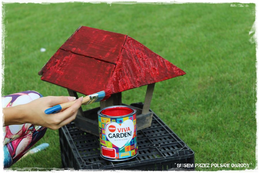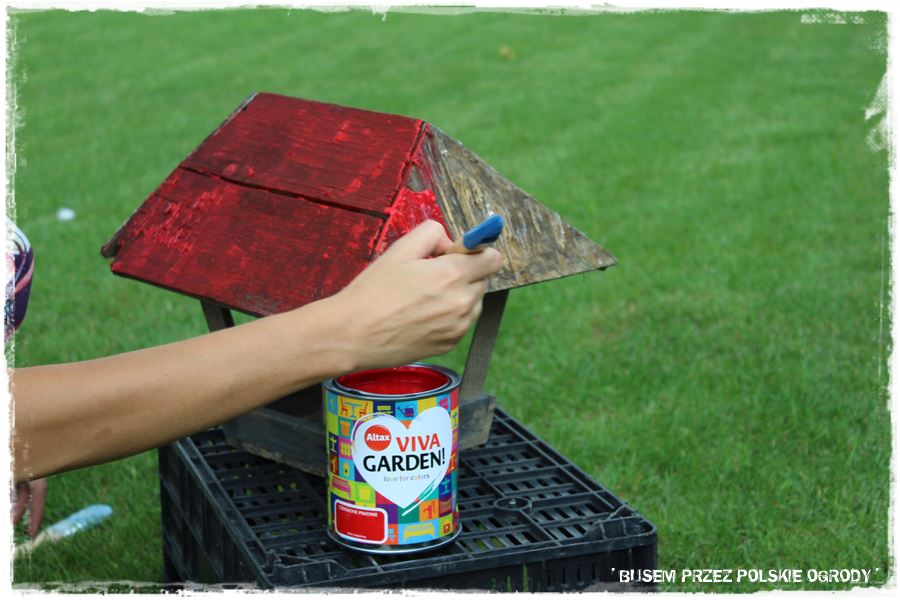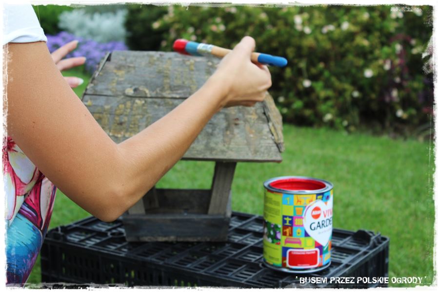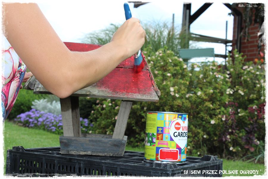 Poza pracami typowo ogrodniczymi, tradycyjnie postanowiliśmy poeksperymentować z farbami. Tym razem wybraliśmy mocny, żywy kolor „czerwone piwonie”, który powędrował na daszek starego, będącego dekoracją karmnika. Swoją drogą dobrze zgra się z innymi, czerwonymi dodatkami tego ogrodu.