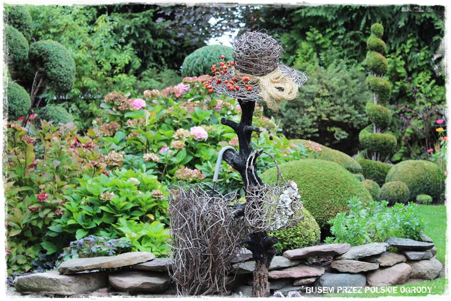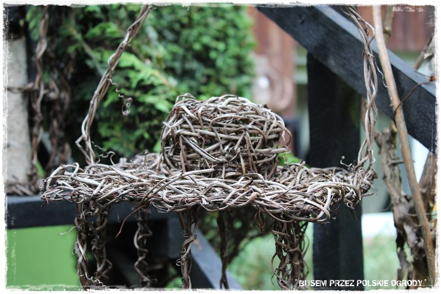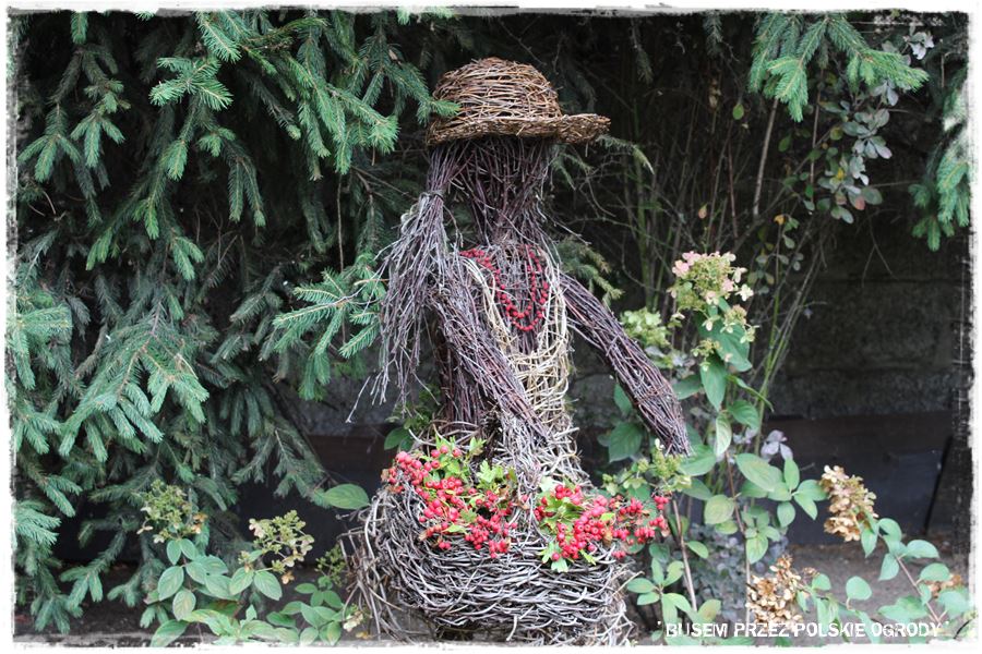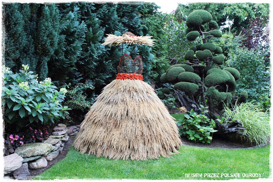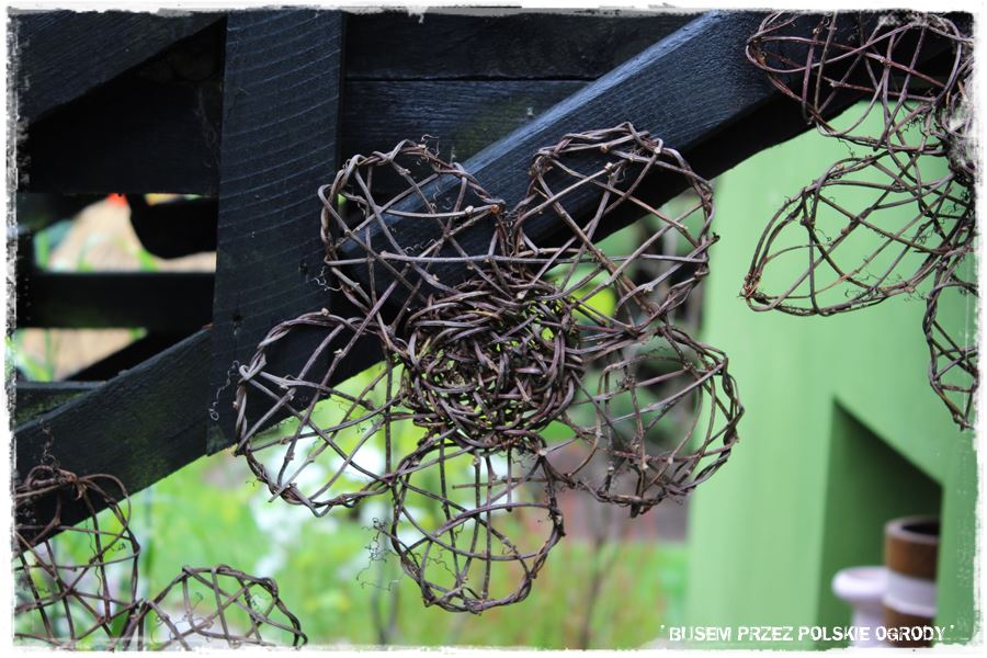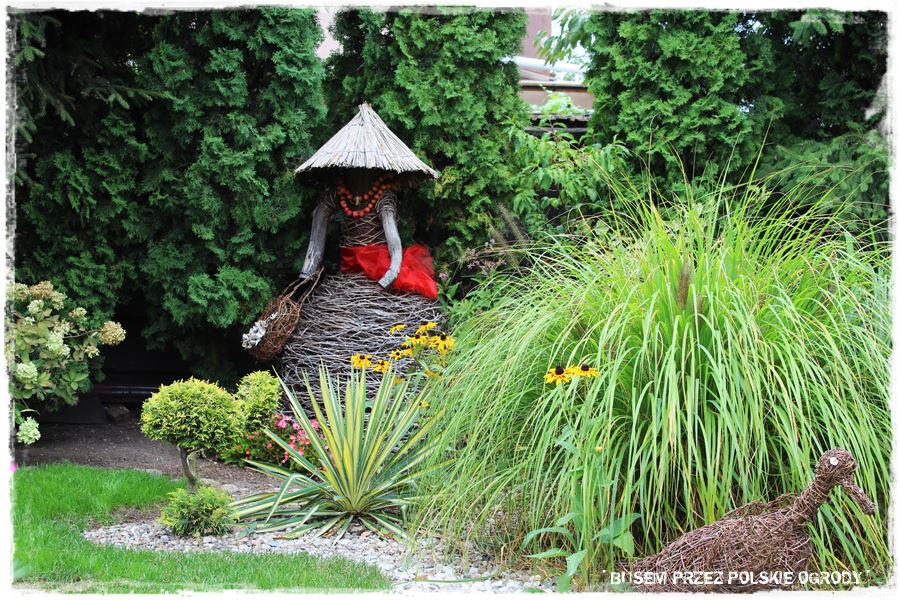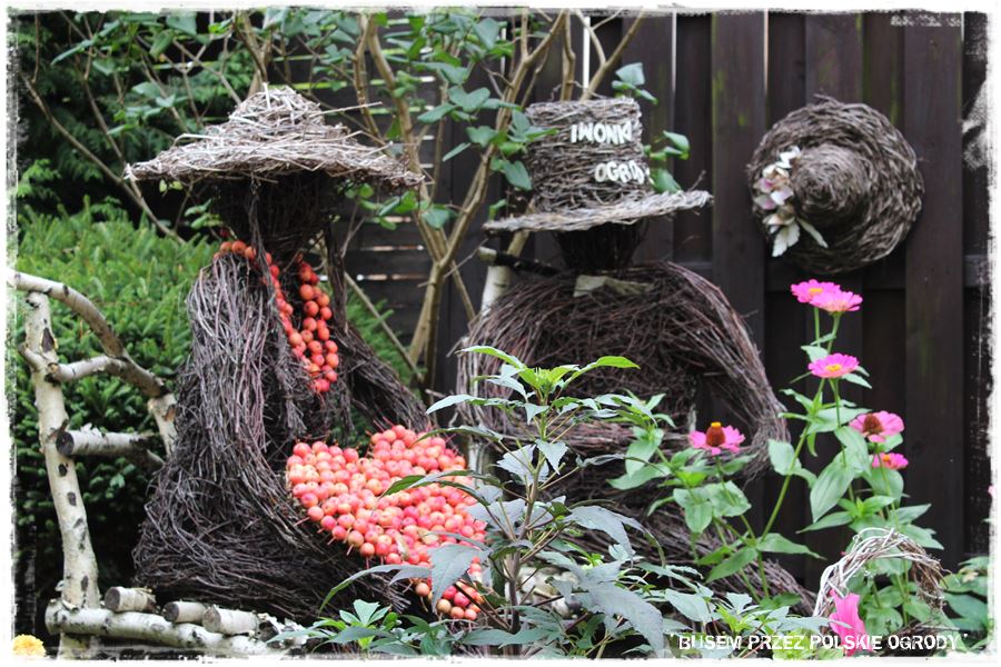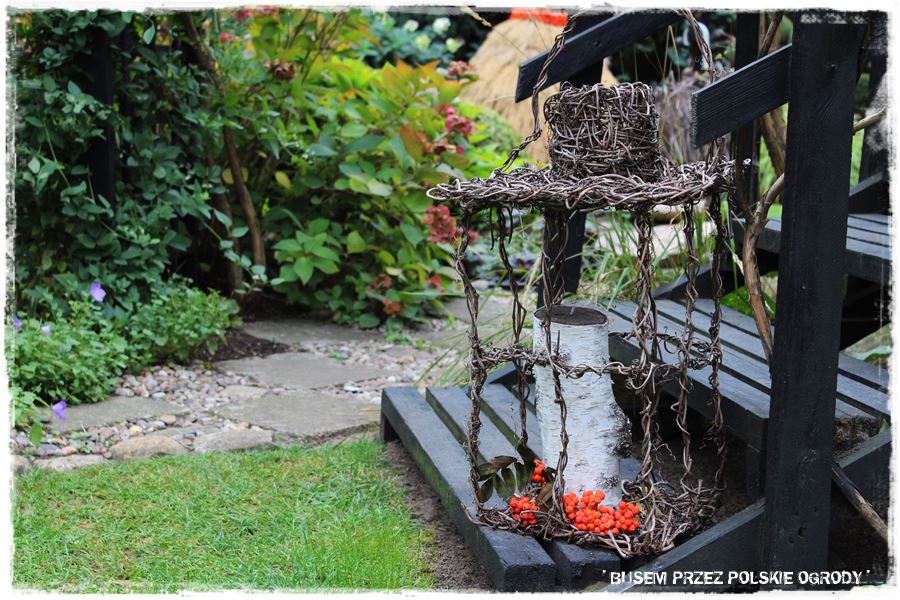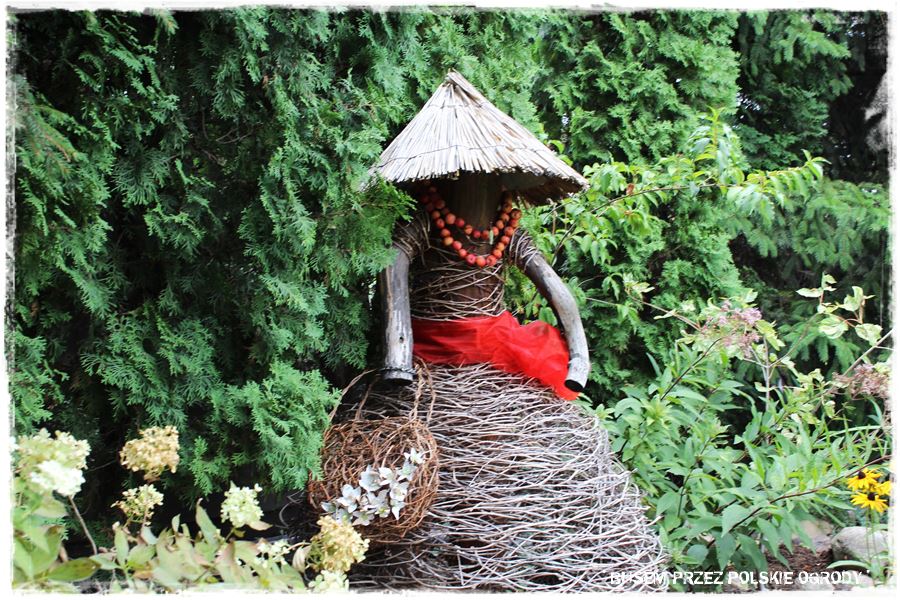 Jak pewnie już wiesz z poprzednich relacji, każdy z odwiedzonych ogrodów staram się na wstępie jakoś nazwać i zatytułować. Tak, aby na początku nastawić Cię na to, czego możesz się po nim spodziewać. Innymi słowy, staram się znaleźć jakąś główną cechę i wyróżnik danego miejsca, który zdecydowanie odróżnia go od pozostałych. I tak jest również w tym przypadku. Pierwszym skojarzeniem, które przychodzi na myśl po wejściu do tego ogrodu jest „królestwo“, a jego Właścicielka to „Królowa dekoracji“. Dekoracje, własnoręcznie przez Nią robione, są dosłownie na każdym kroku. Mniejsze, większe, które łączy jedno: wykonane są niezwykłą pracowitością i pomysłowością, z naturalnych materiałów.