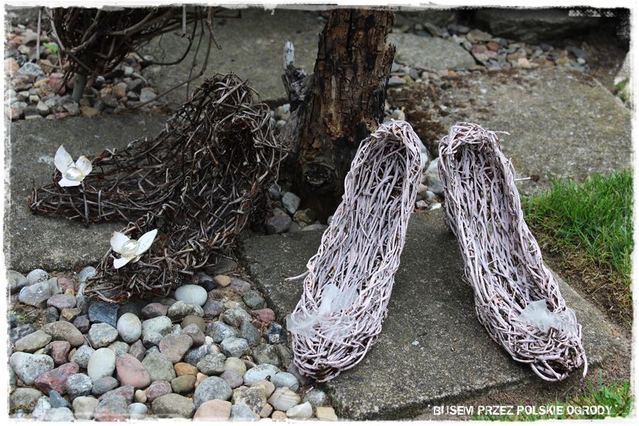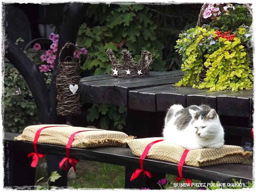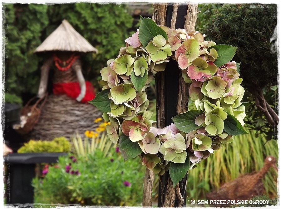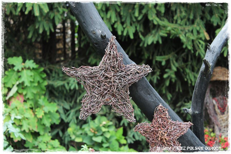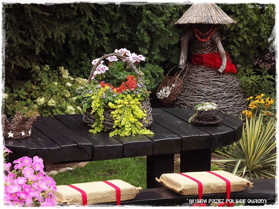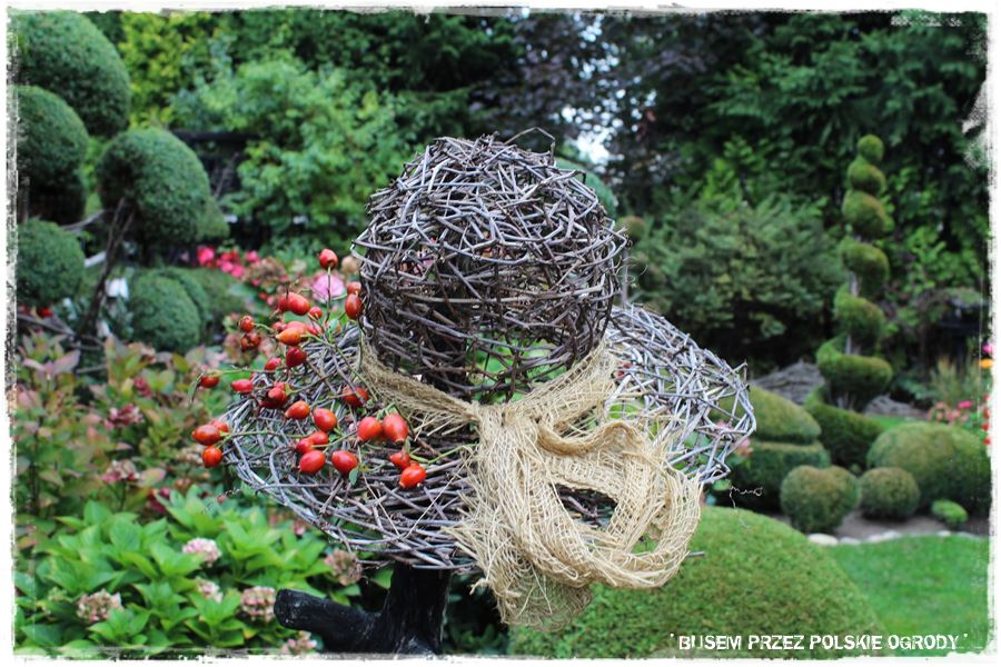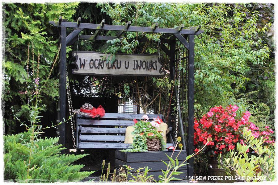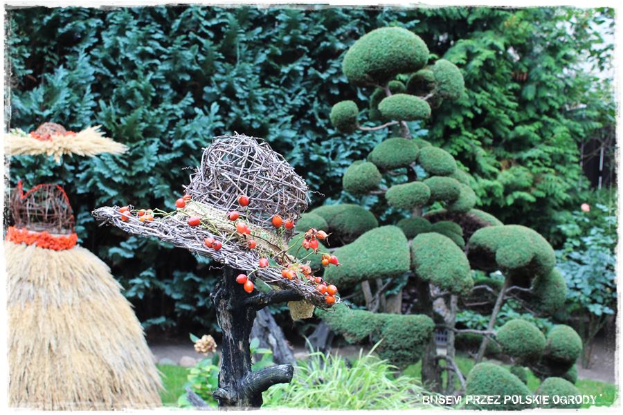 Jak pewnie już wiesz z poprzednich relacji, każdy z odwiedzonych ogrodów staram się na wstępie jakoś nazwać i zatytułować. Tak, aby na początku nastawić Cię na to, czego możesz się po nim spodziewać. Innymi słowy, staram się znaleźć jakąś główną cechę i wyróżnik danego miejsca, który zdecydowanie odróżnia go od pozostałych. I tak jest również w tym przypadku. Pierwszym skojarzeniem, które przychodzi na myśl po wejściu do tego ogrodu jest „królestwo“, a jego Właścicielka to „Królowa dekoracji“. Dekoracje, własnoręcznie przez Nią robione, są dosłownie na każdym kroku. Mniejsze, większe, które łączy jedno: wykonane są niezwykłą pracowitością i pomysłowością, z naturalnych materiałów.